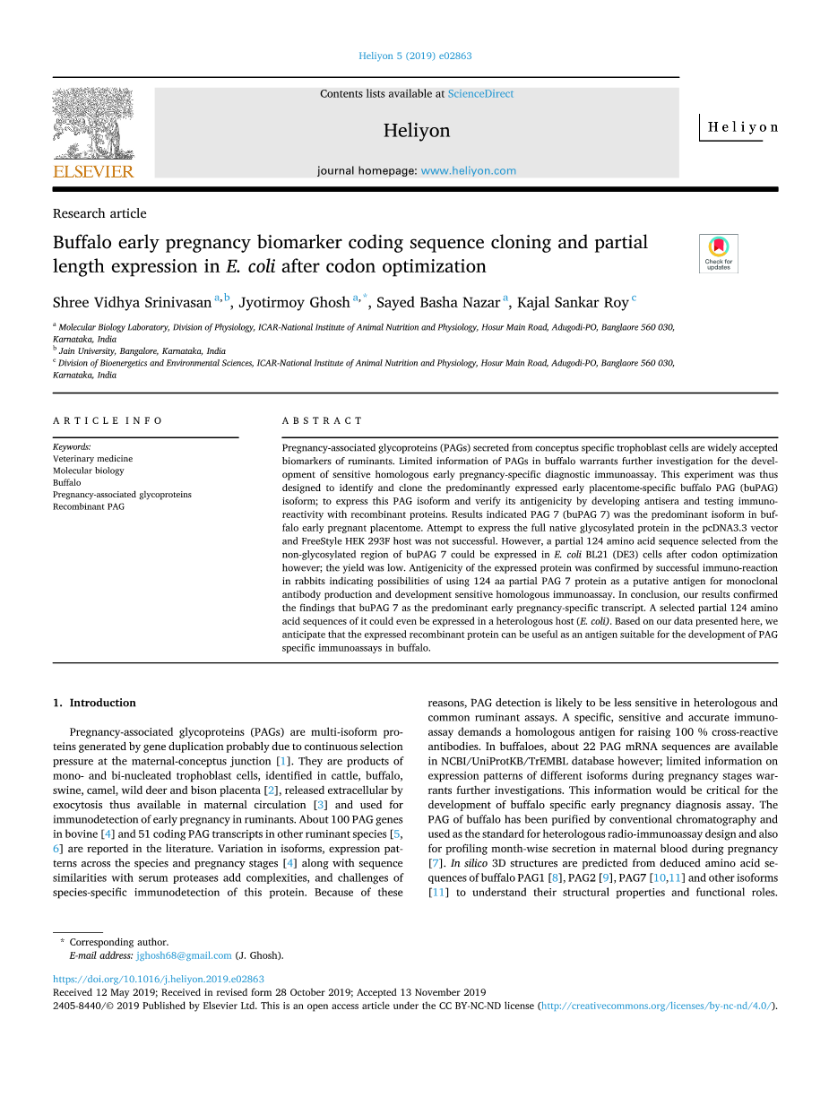 使用天然糖基化PAG作为抗原对于培养特异性抗体至关重要,这是因为抗原呈递细胞中的MHC分子(更确切地说是Ⅱ类)会将抗原呈递给T细胞识别,天然蛋白质结构的任何改变都导致产生反应性和特异性较低的抗体。电子表位预测显示,蛋白质的糖基化区域通常是亲水的,并且含有免疫优势表位,然而抗原表位可能存在于蛋白质的非糖基化区域,它们可以作为抗体生产的靶点。因此,本实验旨在所有异构体序列中确定水牛主要PAG异构体的编码序列,需要克隆这些异构体的开放阅读框(ORFs)并进行测序,经过密码子优化,将PCR产物的部分序列在大肠杆菌中表达,重组蛋白用于制备抗血清,并通过重组蛋白与抗血清的免疫反应性检测其抗原性。