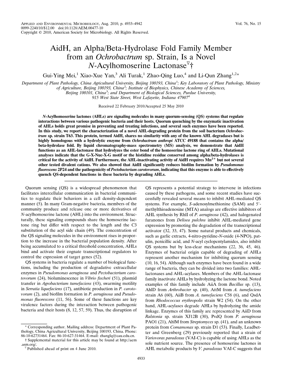 AidH,来自Ochrobactrum sp.的alpha;/beta;水解酶折叠家族成员的一种新型N-酰高丝氨酸内酯酶