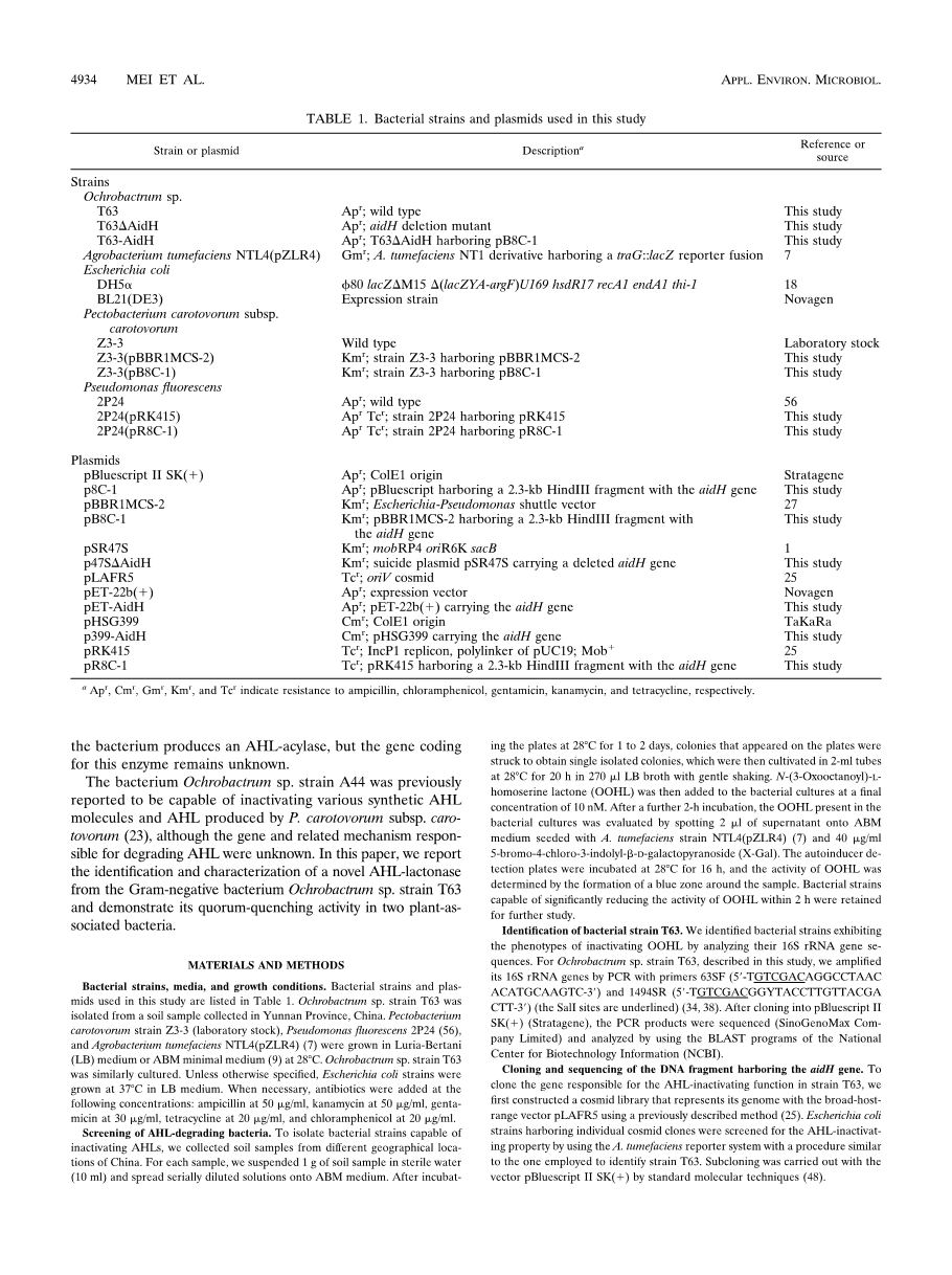 细菌菌株、培养基和生长条件。表1列出了本研究中使用的细菌菌株和质粒。从云南省采集的土壤样品中分离到Ochrobactrum sp.T63菌株。在28°C的Luria Bertani(LB)培养基或ABM最小培养基中培养Pectobacterium carotovorum Z3-3菌株(实验室培养基)、Pseudomonas fluorescens 2P24和Agrobacterium tumefaciens NTL4 (pZLR4)。同样培养Ochrobactrum sp. T63菌株。除非另有规定,大肠杆菌菌株在37°C的LB培养基中生长。必要时,按以下浓度添加抗生素:氨苄西林(50 mu;g/ml)、卡那霉素(50mu;g/ml)、庆大霉素(30mu;g/ml)、四环素(20mu;g/ml)和氯霉素(20mu;g/ml)。