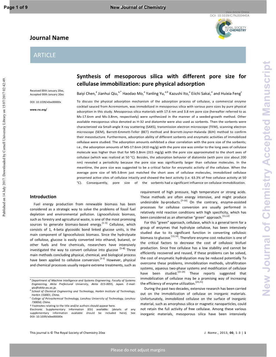 纯物理吸附:用不同孔径介孔二氧化硅固定化纤维素酶外文翻译资料