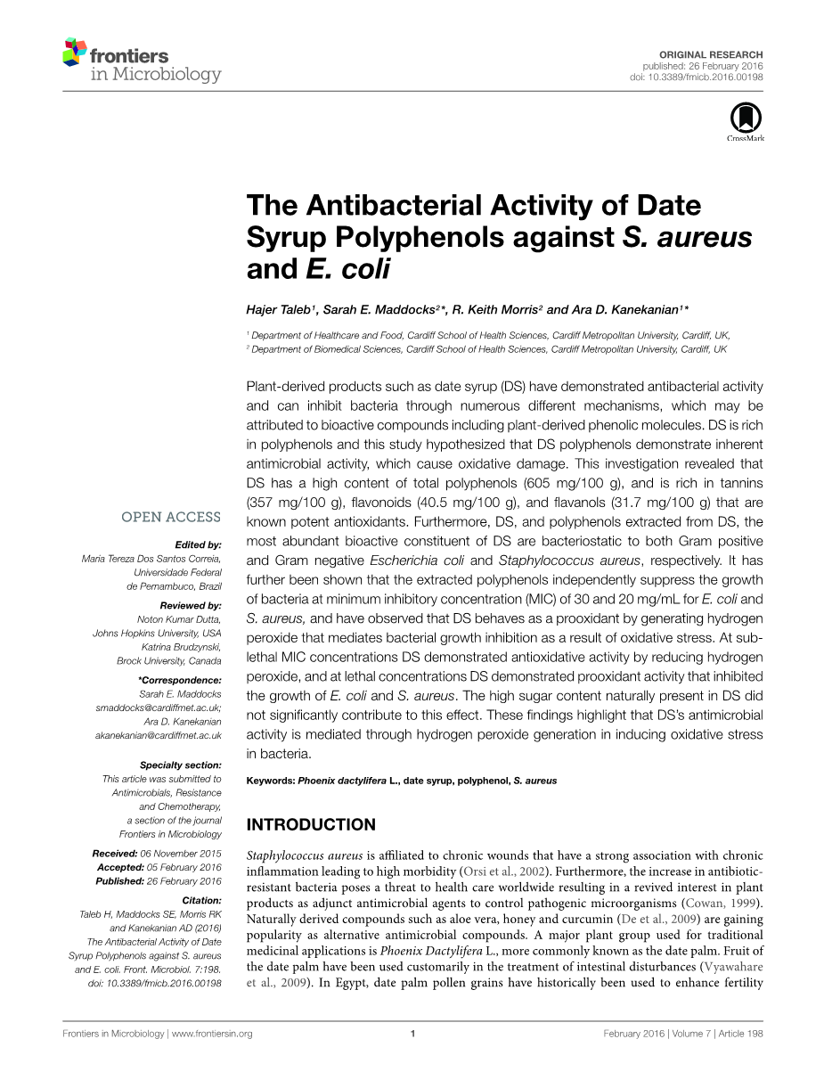 关键词:Phoenix dactylifera L.;日期糖浆;多酚;金黄色葡萄球菌