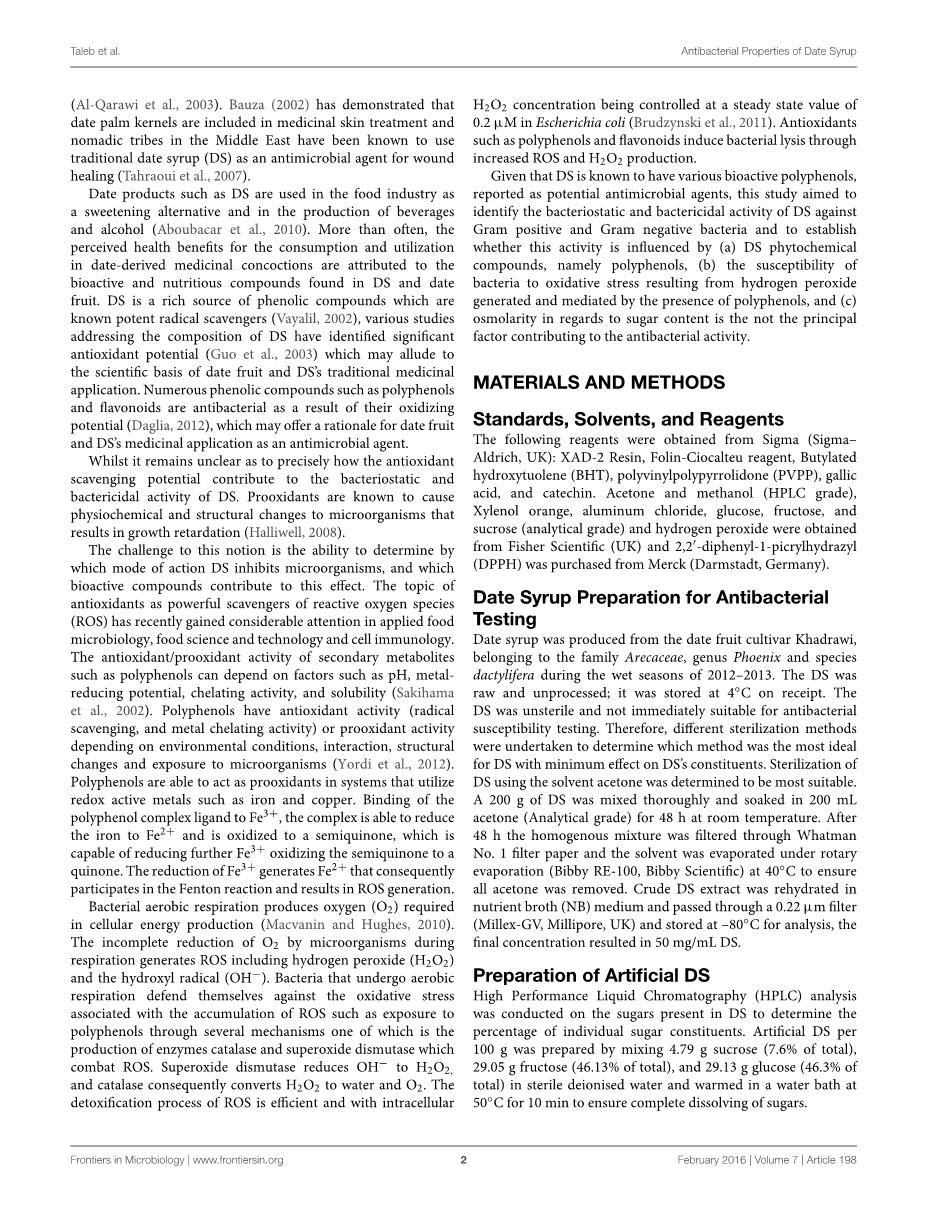植物来源的产品如日期糖浆(DS)已经证明具有抗菌活性并且可以通过许多不同的机制抑制细菌,这可能归因于包括植物来源的酚类分子的生物活性化合物。DS含有丰富 的多酚,本研究假设DS多酚具有固有的抗菌活性,可引起氧化损伤。该调查显示DS含 有高含量的总多酚(605 mg / 100 g),富含单宁(357 mg / 100 g),黄酮类化合物(40.5 mg / 100 g)和黄烷醇(31.7 mg / 100 g)这是已知的强效抗氧化剂。此外,DS和从DS中提取的多酚,DS中最丰富的生物活性成分分别对革兰氏阳性和革兰氏阴性大肠杆菌和金黄色葡萄球菌均具有抑菌作用。进一步表明,提取的多酚可以独立地 抑制细菌的生长,大肠杆菌和金黄葡萄球菌的最大抑菌浓度(MIC)为30和20 mg / mL,并观察到DS通过产生过氧化氢而起到促氧化剂的作用,所述过氧化氢通过氧化应激导致细菌的生长抑制。在亚致死的MIC浓度下,DS通过还原过氧化物表现出抗氧化活性,在致死浓度下,DS表现出抑制大肠杆菌和金黄色葡萄球菌生长的促氧化活性。DS中天然存在的高糖含量没有显著影响这种效果。这些研究结果强调DS的抗菌活性是通过过氧化氢的产生来介导的,诱导细菌的氧化应激。