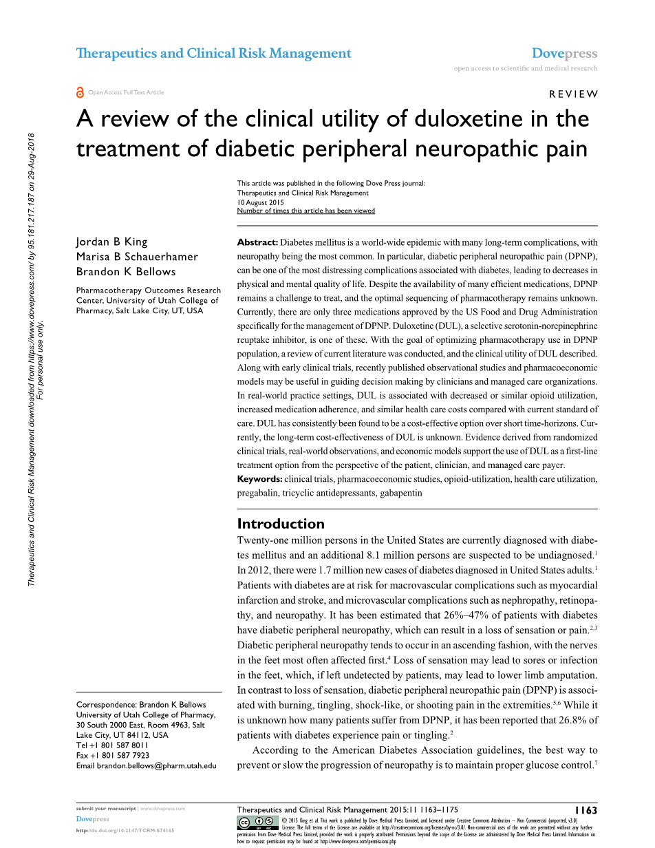 病人身体和精神生活质量下降。尽管有许多有效的药物,DPNP 治疗仍然是一个挑战,药物治疗的最佳顺序仍未确定。 目前,美国食品和药物管理局只批准了三种药物专门用于治疗DPNP。度洛西汀(DUL),是一种选择性5-羟色胺-去甲肾上腺素再摄取抑制剂。 旨在优化 DPNP 中的药物治疗人群,对当前文献进行了综述,并描述了 DUL 的临床效用。连同早期临床试验,最近发表的观察性研究和药物经济学模型可能有助于指导临床医生和管理护理机构的决策。在现实的实践环境中,dul与阿片类药物的使用减少或类似的情况有关。与目前的医疗标准相比,增加了药物依从性和类似的医疗费用。在实际操作设置中,DUL与阿片类药物利用率降低或相似,与目前的护理标准相比,增加了药物依从性和类似的医疗保健费用。 在短时间范围内,DUL一直被认为是一种具有成本效益的选择。 目前,DUL的长期成本效益尚不清楚。 来自随机的证据临床试验,现实世界观察和经济模型支持使用DUL作为第一线从患者,临床医生和管理式护理付款人的角度来看治疗方案。