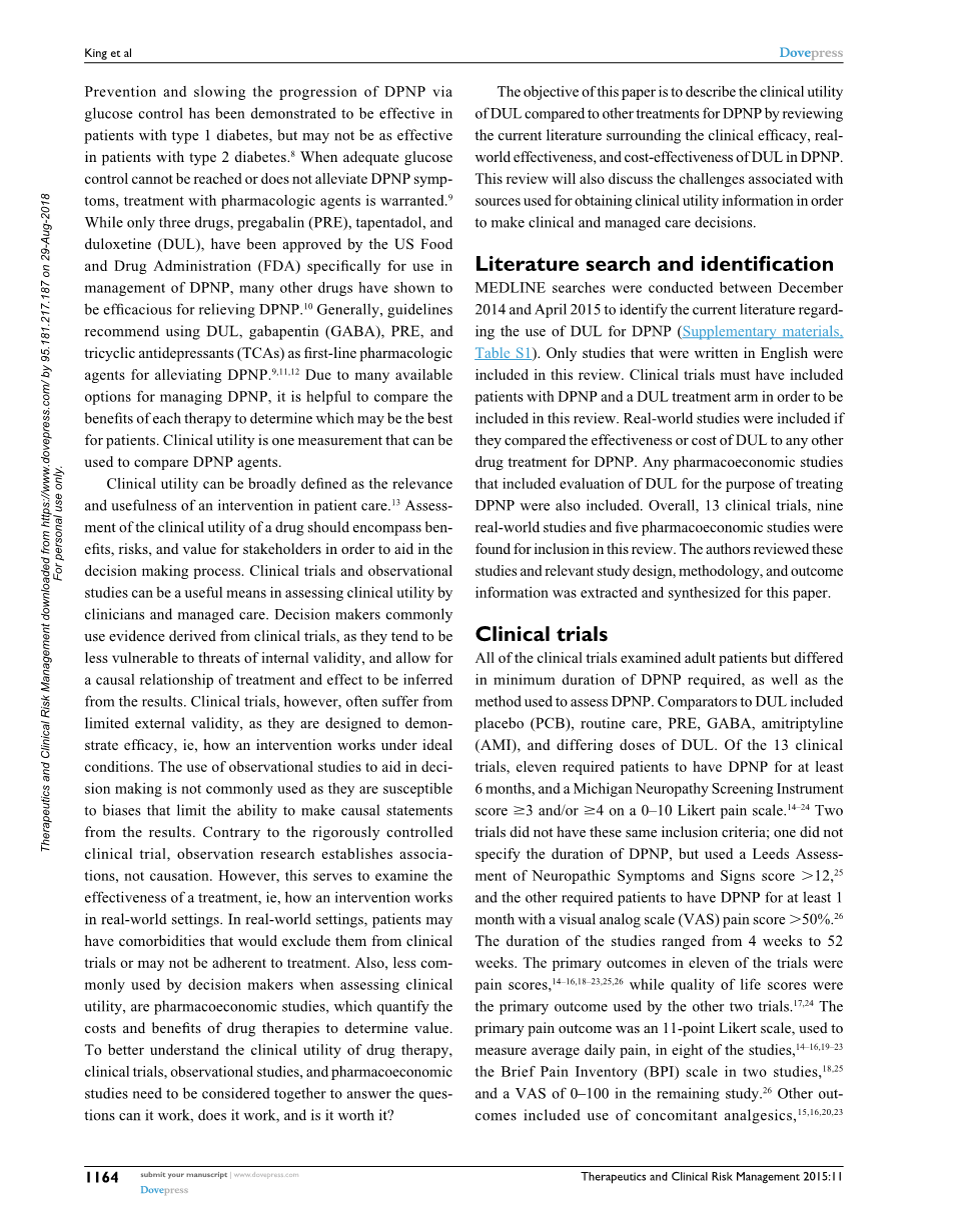 在2014年12月和2015年4月之间进行了 MEDLINE 检索 ,旨在识别关于 DUL 用于 DPNP 的当前文献(补充材料,表S1)。 只有以英文撰写的研究是 包含在本综述中。 临床试验必须包括 DPNP 和 DUL 治疗组患者,以便包含在本综述中。如果符合以下条件,则纳入真实世界研究 。他们将 DUL 的有效性或成本与任何其他器械进行了比较 DPNP 药物治疗。 任何药物经济学研究 包括用于治疗目的的 DUL 评价 还包括 DPNP。 总体上,13项临床试验,9项 实际研究和5项药物经济学研究为 发现纳入本综述中。 作者对这些内容进行了综述 研究和相关研究设计、方法和结局 ,并在本文中提取并合成了信息。