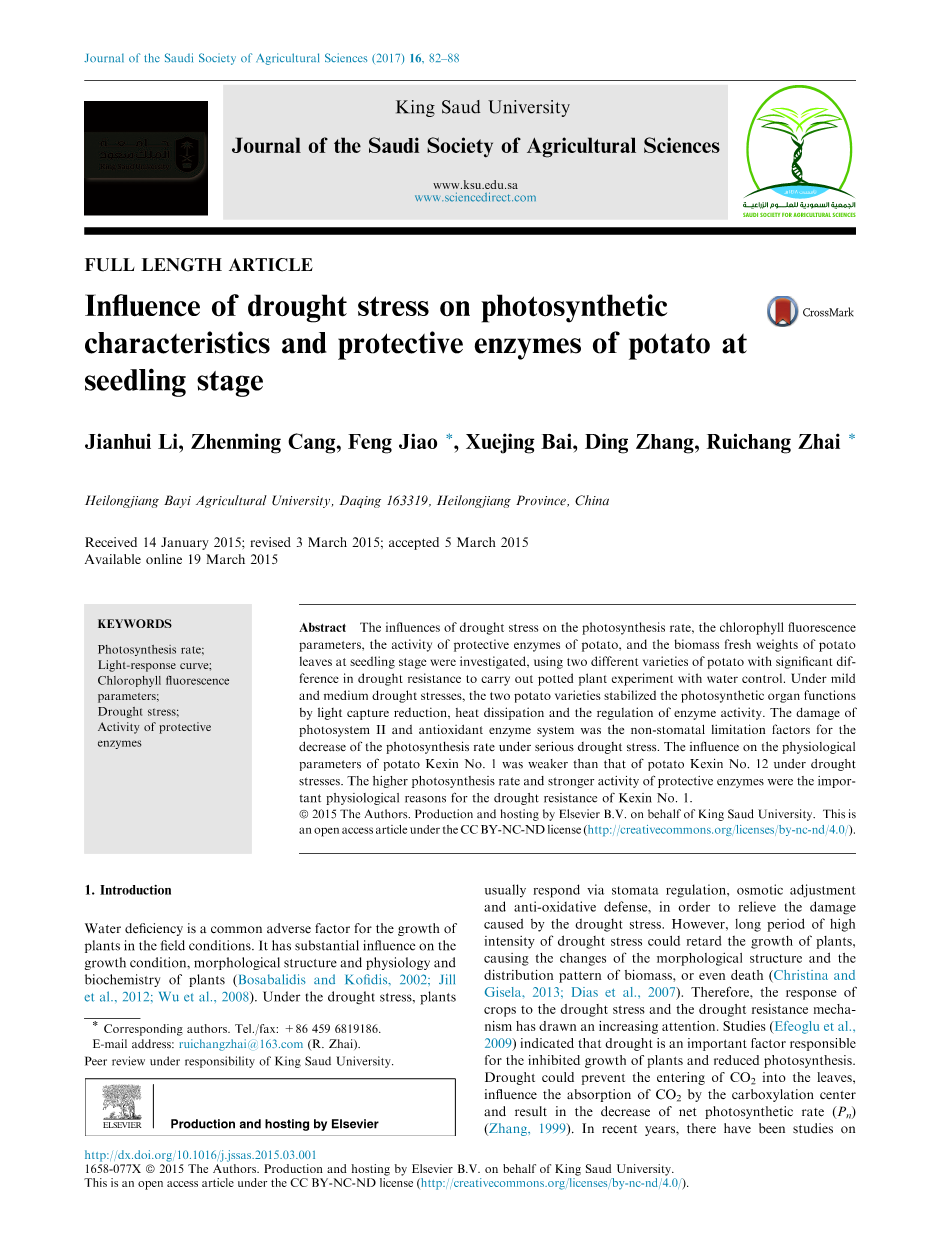缺水是田间条件下植物生长的常见不利因素。它对植物的生长条件,形态结构和生理生化有重要影响(Bosabalidis和Kofidis,2002年;吉尔 等人,2012;吴等人,2008).在干旱胁迫下,植物通常通过气孔调节,渗透调节和抗氧化防御来应对,以减轻干旱胁迫造成的损害。然而,长时间的高强度干旱胁迫可能会阻碍植物的生长,导致形态结构的变化和生物量的分布格局,甚至死亡(克里斯蒂娜和 吉塞拉,2013岁;Dias等,2007).因此,作物对干旱胁迫和抗旱机制的反应引起了越来越多的关注。学习 (Efeoglu等人, 2009)表明干旱是导致植物生长受抑制和光合作用减弱的重要因素。干旱可以防止CO2 进入叶片,影响羧化中心对CO2 的吸收,导致净光合速率降低(Pn)(张,1999).近年来,有研究光氧化过程中叶片荧光特性与膜脂过氧化的关系。结果表明,PS II光能转换和活性氧代谢与应激密切相关(Massacci等,1990;王 等,2006).因此,对光合作用,保护酶活性及两者之间关系的综合研究有助于解释光能转化利用的机理以及抗旱和产量增加的机理。