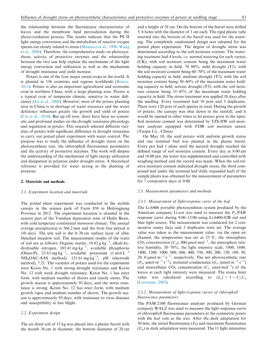 马铃薯是世界四大谷类作物之一。它种植在全球156个国家和地区(凉风习习, 2013).马铃薯也是中国北方重要的农业和经济作物,种植面积大。马铃薯是一种典型的温带气候,对缺水敏感(Xu等,2008).但是,我国大部分马铃薯种植区缺水,缺水对马铃薯的生长和产量影响很大(Lin et al。,2010).但到目前为止,还没有对马铃薯抗旱生理和调控进行系统深入的研究。本研究选择不同品种的马铃薯抗旱性差异显着,进行盆栽试验水分控制。目的是研究干旱胁迫对光合速率,叶绿素荧光参数和保护酶活性的影响。这项工作将加深对干旱胁迫下马铃薯光能利用和消散机制的认识。为马铃薯种植节水提供了理论参考。