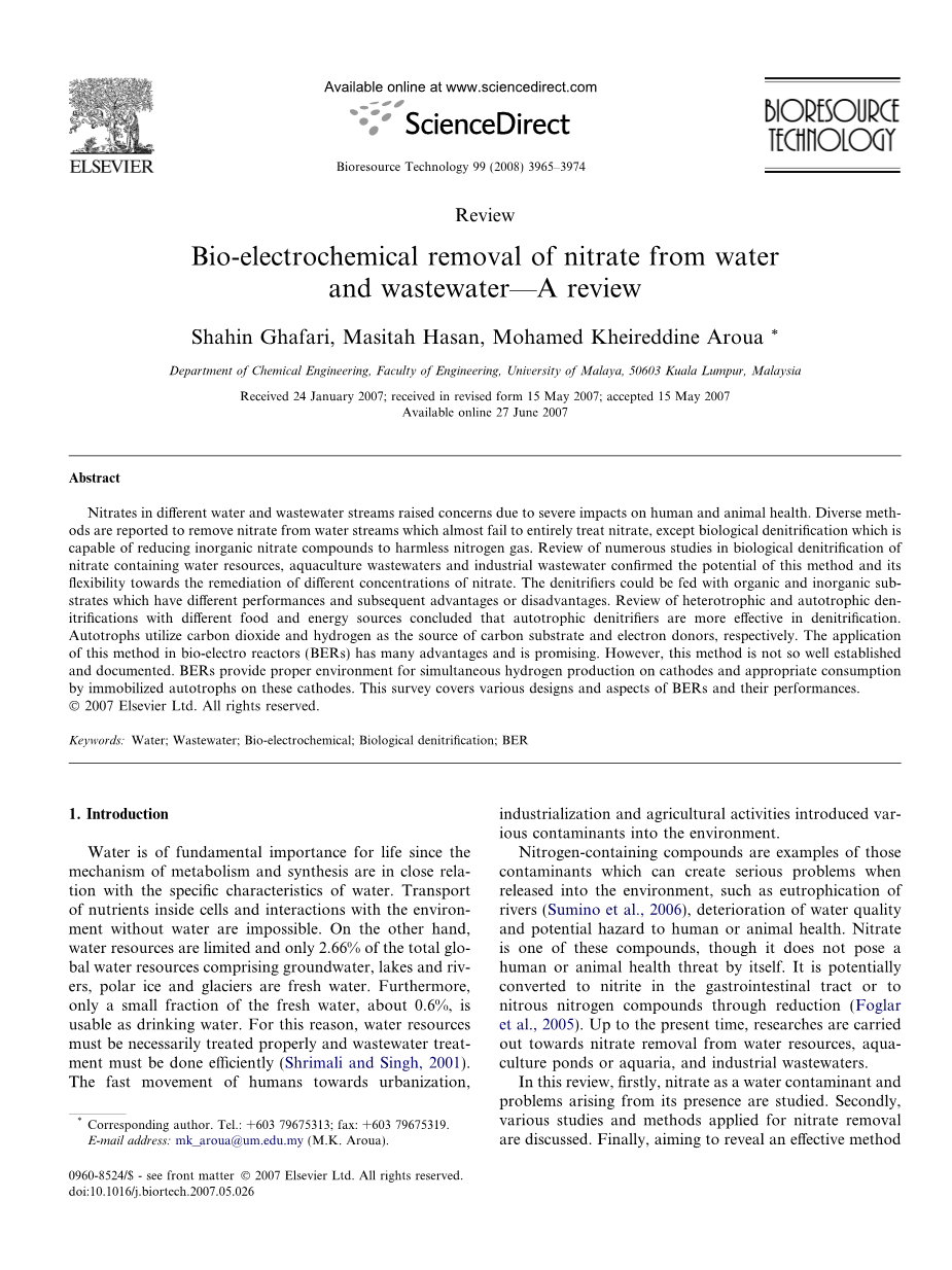 不同水体中的硝酸盐对人类和动物健康造成的影响引起了很多关注。各种去除水体中硝酸盐的方法几乎都不能使硝酸盐全部去除,除了生物反硝化能将剩余的无机硝酸盐成分转化为无害的氮气。对生物反硝化的大量研究的总结(水源、水产作物废水、工业废水)证实了这种方法对不同浓度硝酸盐的潜力和灵活性。反硝化过程可以用有机或无机底物作为营养物质,也会产生不同的现象和优缺点。对通过不同条件培养异养菌和自养菌反硝化可以总结出自养菌在反硝化能力上效率要高于异养菌。自养菌分别将二氧化碳和氢作为碳源和电子供体。这种在电化学反应器(BER)中的方式的应用有许多优点而且稳定。然而,这种方法不太容易被系统化和书面化。BER为协调阳极氢气的产生和固定在阳极的自养型菌对氢气的消耗提供了适宜的环境。这篇文章包含了几种BER的类型和它们的效果。