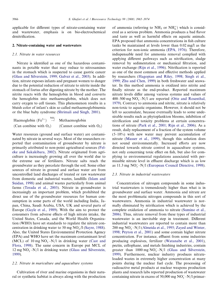 含氮物质在一些工业废水中的浓度要极大地高于地下水和地表水。氨和硝酸盐在这类废水中是最难处理的含氮物质。工业废水中的铵盐通常通过硝化作用被氧化为硝酸盐。因此,在水处理中,硝酸盐的去除是必要的。不同的工业废水普遍硝氮浓度要高于200mg/l,有些会更高。比如,一些工业生产的爆炸物、肥料、果胶、塞璐玢和金属加工行业所产生的废水的硝氮浓度会在1000mg/l以上。此外,核工业在核燃料循环的许多步骤中会产生具有极其高浓度的硝酸盐负载废水。