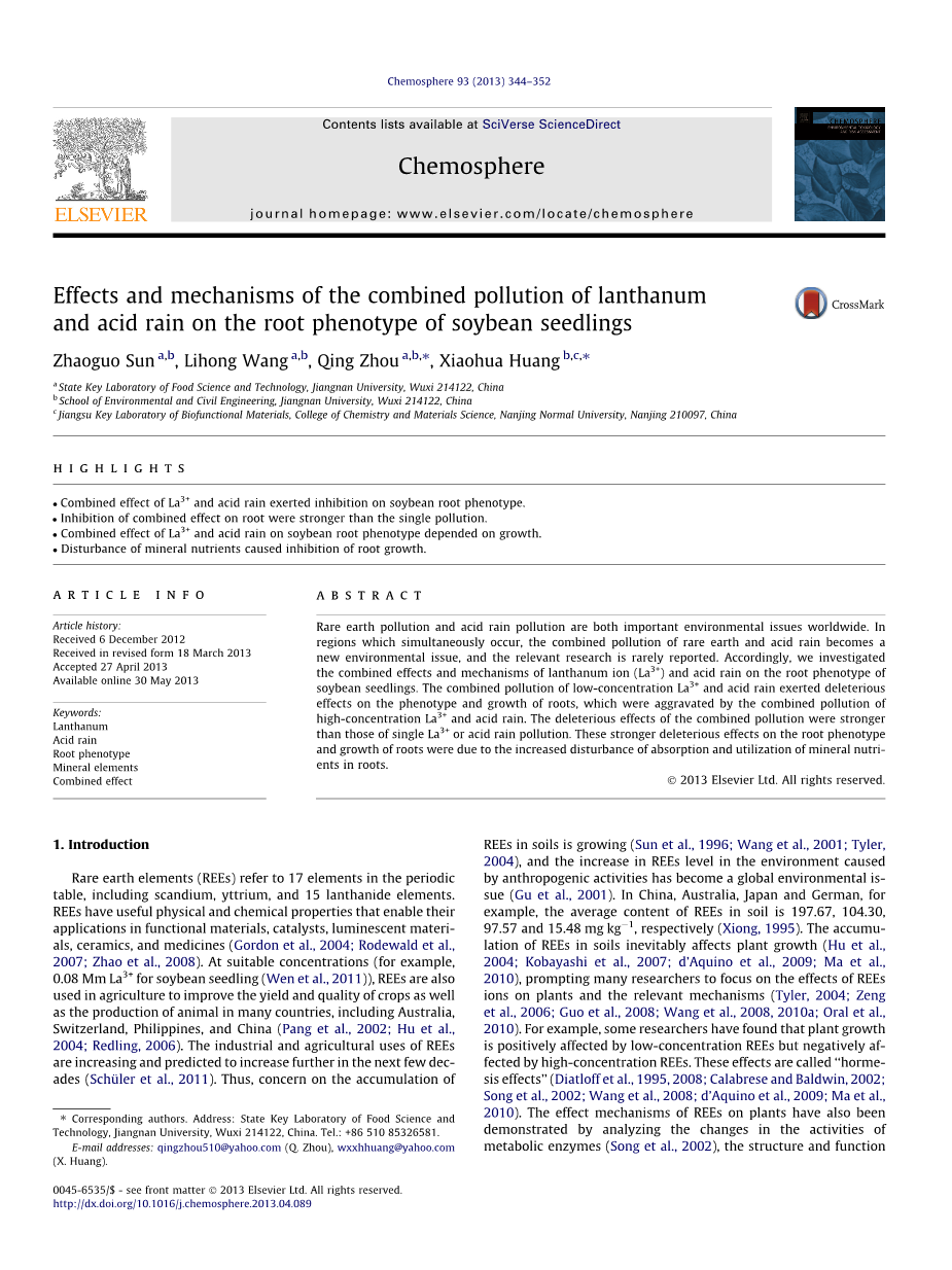大豆(Glycine max L.)是一个粮食作物,美国EPA上有研究它的药害和应用(2012)。镧是在元素周期表中的第一个镧系元素并且在土壤中无处不在(Tyler, 2004)。这个课题研究了La 3+和酸雨对大豆幼苗根系表型、根系生长、根系矿质元素含量和根系活力的联合效应,目的是了解稀土和酸雨对植物根的复合污染机制的影响。