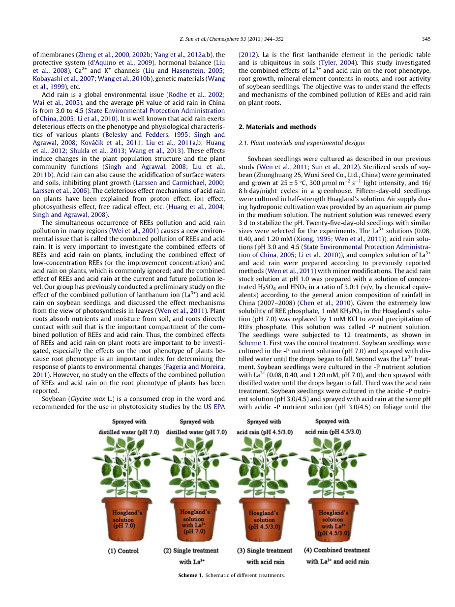 在许多地区,稀土元素的污染和酸雨污染的同时发生(Wei 等, 2001)产生了新的环境问题,这被称为稀土和酸雨的复合污染。这对稀土和酸雨对植物的联合作用和稀土元素和酸雨的联合作用在当前和未来的污染水平的研究非常重要,包括通常被忽略的低浓度(高浓度)的稀土元素和酸雨对植物的联合作用的研究。本课题组对镧离子(La 3 )和酸雨对大豆幼苗的联合污染效应进行了初步研究,并从对叶片光合作用的影响机制上进行了初步探讨(Wen 等, 2011)。植物根系从土壤中吸收养分和水分,根系直接接触土壤,是稀土和酸雨的复合污染的重要的环节。因此,调查稀土和酸雨对植物根的联合影响是十分重要的,尤其是对植物的根的表型的影响,因为根的表型是确定植物对环境变化的响应的一个重要的指标(Fageria andMoreira,2011)。然而,稀土和酸雨对植物的根的表型的复合污染的影响还没有研究报道。
