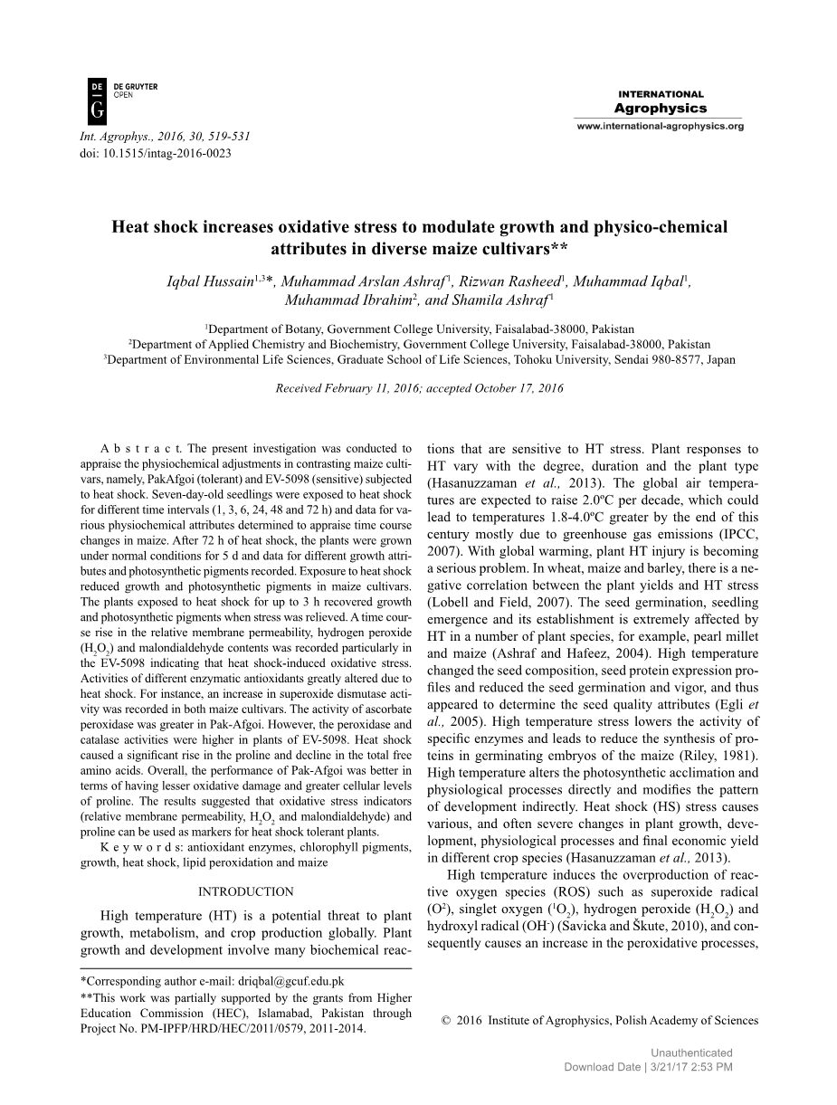 本研究旨在评估对比玉米栽培品种PakAfgoi(耐受型)和EV-5098(敏感型)在受热激时的生化反应。 对7日龄幼苗进行不同时间间隔(1,3,6,24,48和72 h)的热激处理,并确定评估玉米各种物理化学属性的数据变化。植物在正常条件下生长5天,记录不同生长因子和光合色素的数据。热激使玉米的生长速度和光合色素的合成减少。当热激3小时的植物在热激减轻时恢复了生长和光合色素。在EV-5098中记录了相对膜透过性,过氧化氢和丙二醛含量随时间上升,表明高温诱导的氧化应激。由于高温热激,不同保护酶的活性大大改变。例如,两个玉米品种都记录到超氧化物歧化酶活性的增加。 Pak-Afgoi中抗坏血酸过氧化物酶的活性更高。但在EV-5098植株中过氧化物酶和过氧化氢酶活性较高。热激引起脯氨酸含量显着增加和总游离氨基酸含量下降。总体而言,Pak-Afgoi的表现较好,具有较低的氧化损伤和更高的脯氨酸细胞水平。结果表明,氧化胁迫指标(相对膜透性,过氧化氢和丙二醛含量)和脯氨酸含量可作为耐热休克植物的标记。