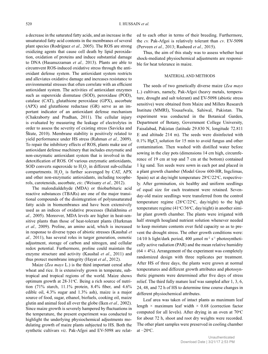 玉米是小麦和大米之后的第三种重要谷物。它广泛种植于世界温带,亚热带和热带地区。玉米在28-31℃下表现出最佳生长。作为营养丰富来源遍布全球(71%淀粉,11.1%蛋白质,8.4%纤维和4.6%食用油,4.3%糖和1.3%灰),玉米是食物,可作为糖,乙醇,生物燃料,食用油,玉米淀粉和动物饲料的原料(Iken,2002)。由于温度波动严重阻碍了玉米的生长,因此本实验旨在研究高温对玉米植物生长调节和基础生理调节的影响,探究Pak-Afgoi和EV-5098在育种方面相互关联,此外,Pak-Afgoi比 EV-5098耐受性好,合成新的栽培品种。(Perveen,2013; Rasheed,2015)。因此,本研究的目的是评估热激对玉米耐热性生理化学调节的影响。
