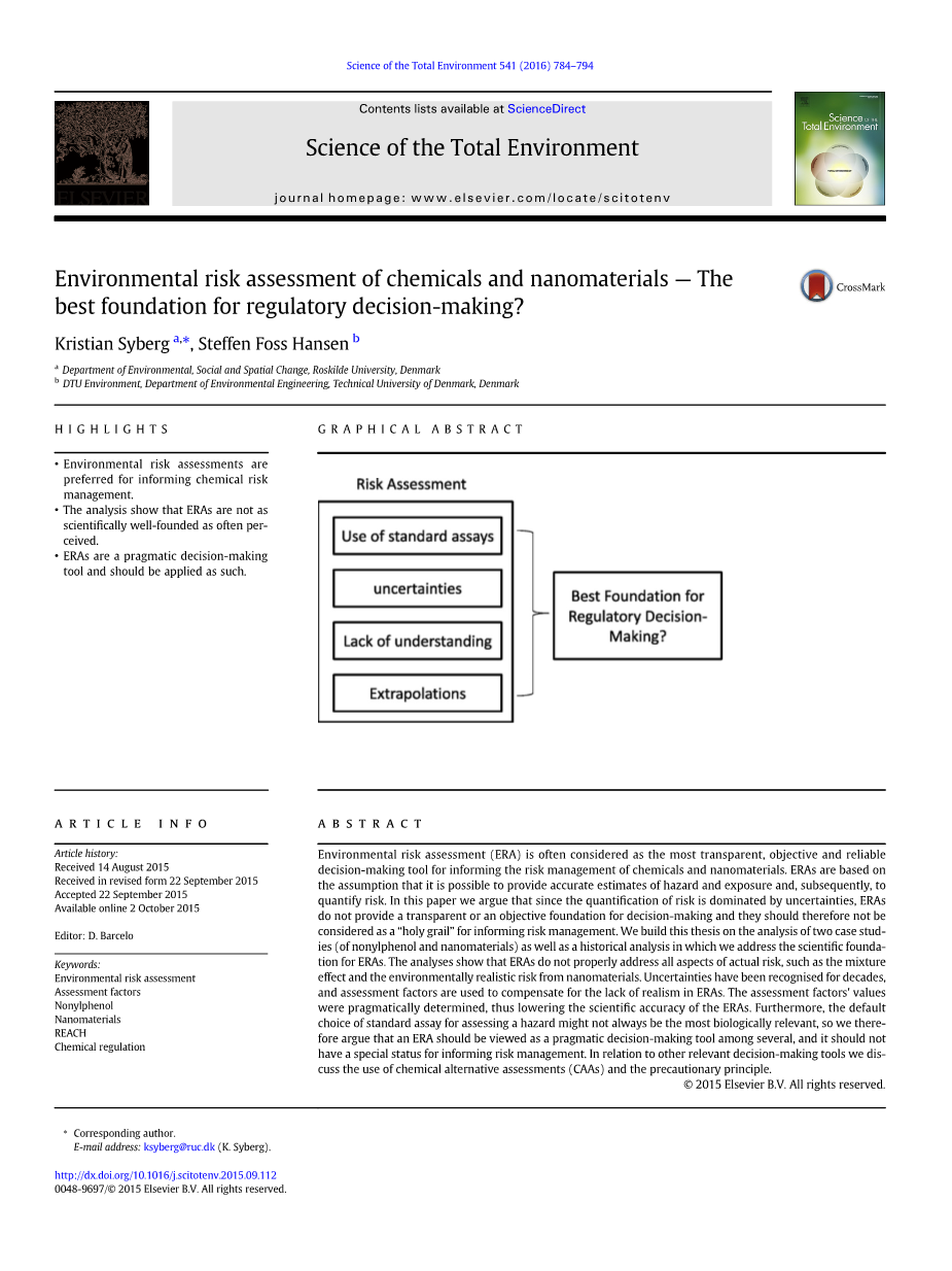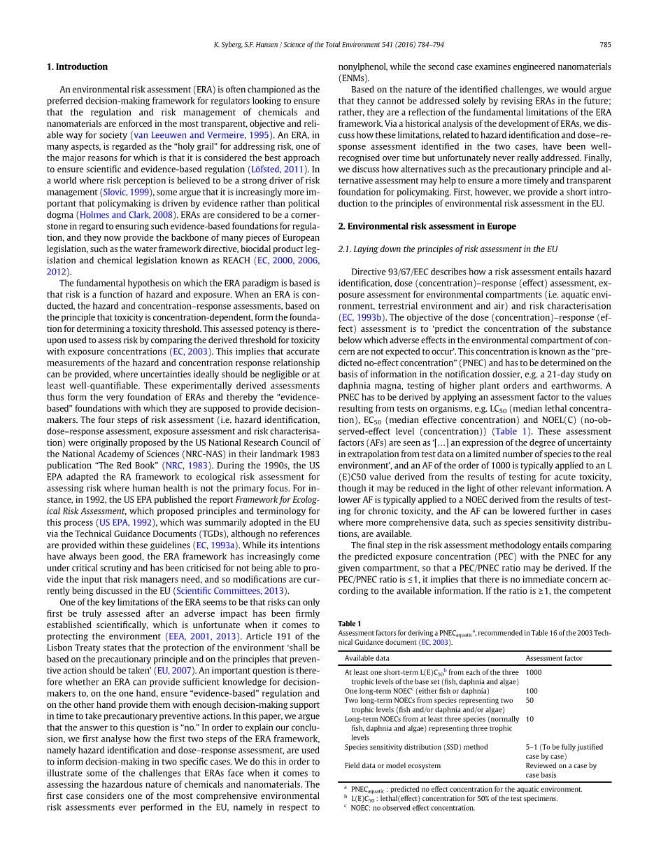 这个时代的一个关键限制似乎是,只有在科学上坚定地确立了负面影响之后才能真正评估风险,这在保护环境方面是不幸的(EEA, 2001, 2013)。《里斯本条约》第191条规定,环境保护应基于预防原则和应采取的预防措施的原则(欧盟,2007)。一个重要的问题是,一个时代能否为决策者提供足够的知识,一方面确保“以证据为基础”的监管,另一方面为他们提供足够的决策支持,及时采取预防性的预防措施。在本文中,我们认为这个问题的答案是“不”。为了解释我们的结论,我们首先分析了时代框架的前两个步骤,即危害识别和剂量-反应评估,用于在两个具体案例中告知决策。我们这样做是为了说明在评估化学物质和纳米材料的危险性质时所面临的一些挑战。第一个案例是欧盟执行的最全面的环境风险评估之一,即关于。壬基酚,而第二种情况则考察工程纳米材料(ENMs)。