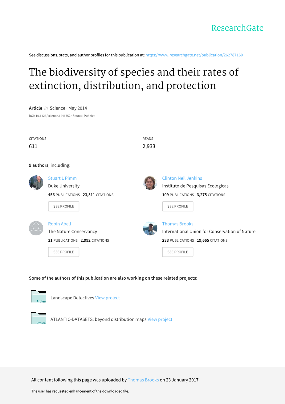 Stuart L Pimm(杜克大学),Clinton Neil Jenkins(生态研究学会),Robin Abell(大自然保护协会),Thomas Brooks(世界自然保护联盟)
