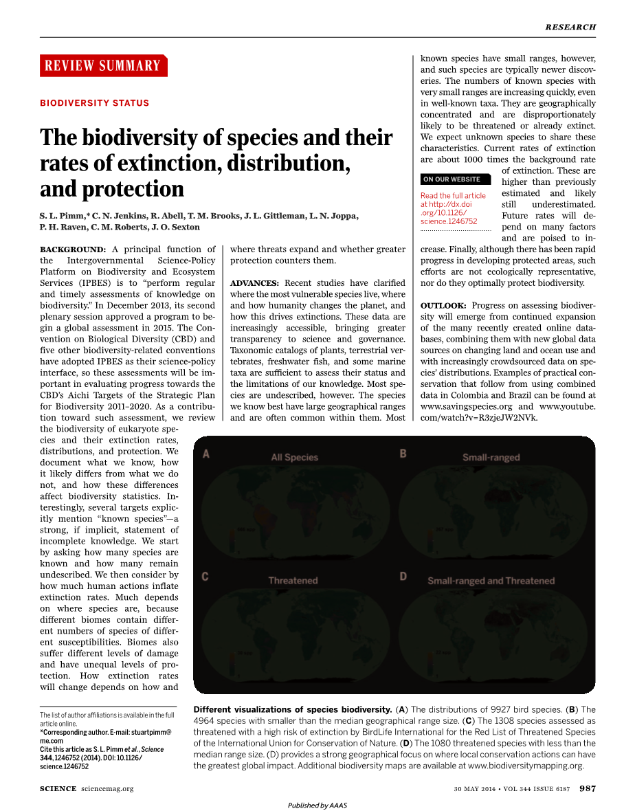 最近的研究阐明了最易危物种生活在哪里,人类如何改变地球,以及如何进一步如何导致其灭绝的。我们评估关于物种、它们的分布和状态的关键统计数据。大多数都没有描述。我们了解的那些物种通常有很大的地理分布范围,而且往往在很常见。大多数已知物种的分布范围都很小。即使在已知的类群中,小范围物种的数量也在迅速增加。它们在地理上比较集中,且可能或多或少受到威胁甚至已经灭绝。目前的物种灭绝速率大约是可能的本底物种灭绝速率的 1000倍。未来的灭绝速率取决于多种因素,并极有可能上升。虽然在开发保护区方面取得了快速进展,但这种努力并不具有生态代表性,也不能最佳地保护生物多样性。