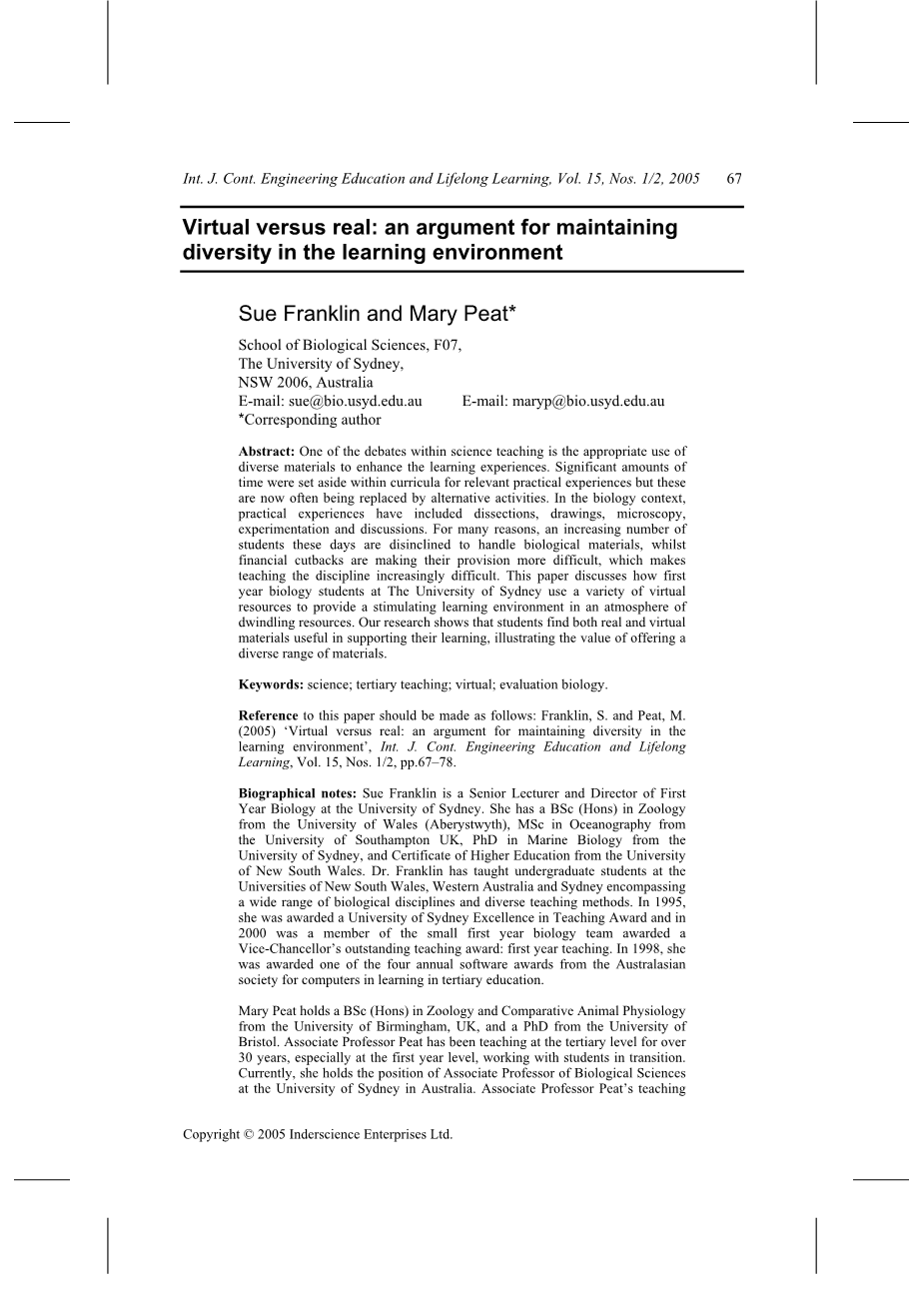 这篇论文的参考文献应该如下:Franklin, S.和Peat, M.(2005)“虚拟与真实:在学习环境中保持多样性的一个论点”,Int。《工程教育与终身学习》,第15卷,第1/2期,第67 - 78页。