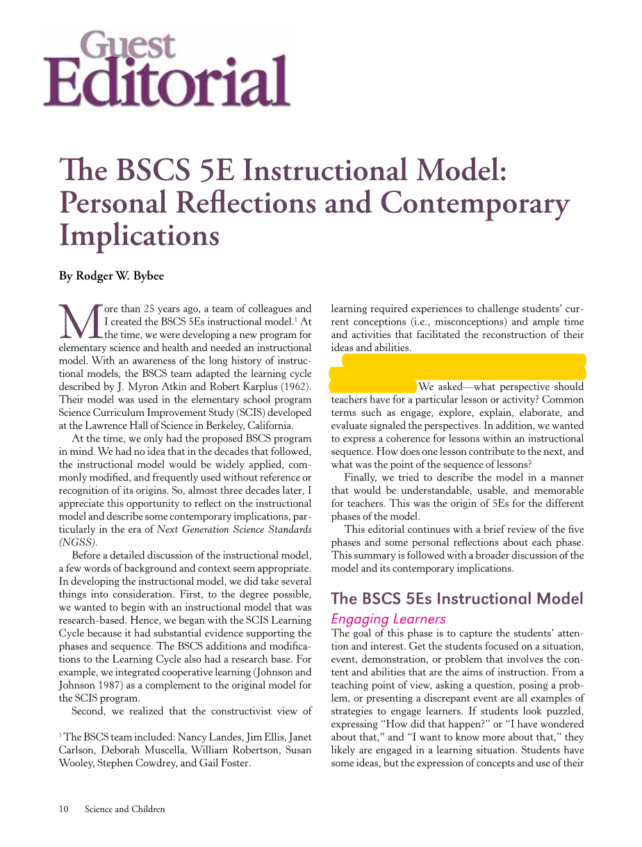25年前,我和我的团队创建了BSCS 5E教学模式。1那时,我们正在开发一个基础科学和健康的新项目,需要一种教学模式。由于意识到教学模式的悠久历史,BSCS队伍采用了J. Myron Atkin and Robert Karplus (1962)描述的学习周期。他们的模型被用于在加州伯克利的劳伦斯科学馆开发的小学科学课程改进研究(SCIS)。