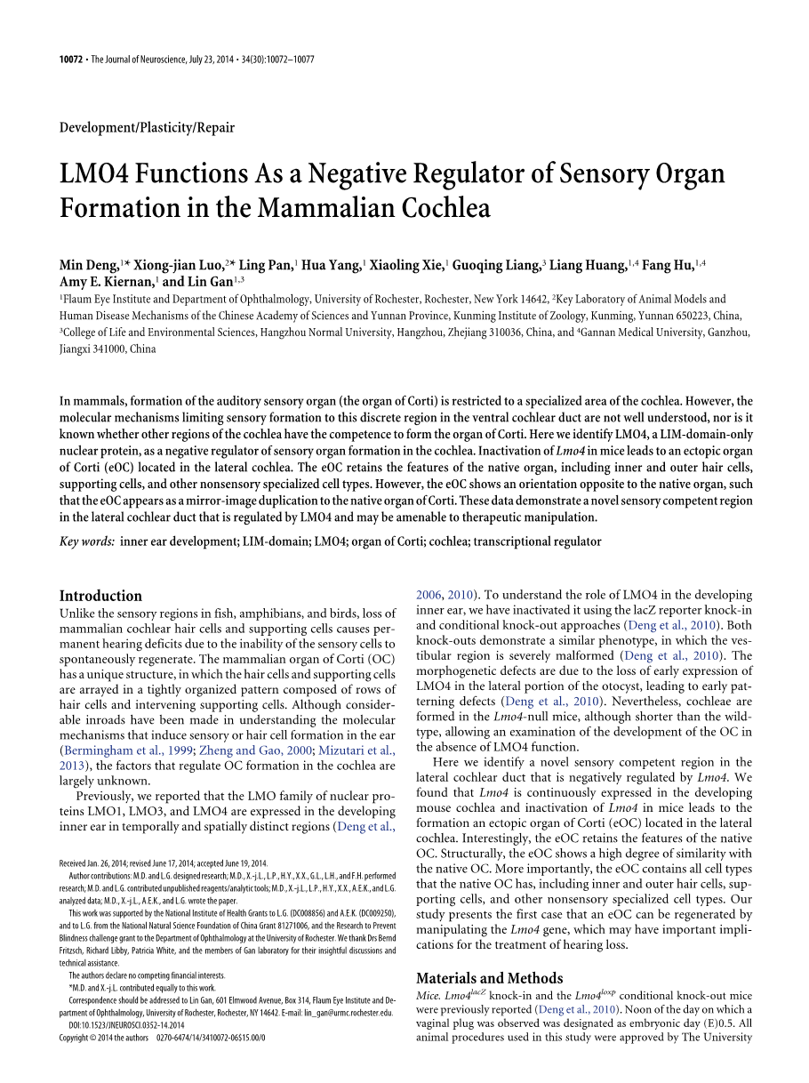 原文作者 Min Deng,1* Xiong-jian Luo,2* Ling Pan,1 Hua Yang,1 Xiaoling Xie,1 Guoqing Liang,3 Liang Huang,1,4 Fang Hu,1,4 Amy E. Kiernan,1 and Lin Gan1,3