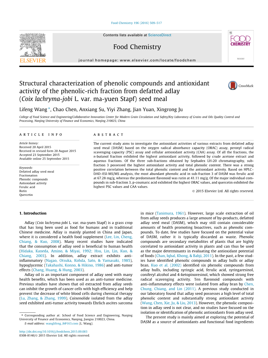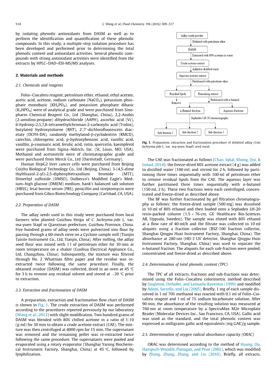许多最近的研究已经表明薏苡仁的消耗,有益于人体健康(高、金田,氨基酸,和miyai,1992;许,林,林,郭,amp;amp; 蒋,2003)。此外,薏仁提取物具有抗炎(长尾,大冢,Kohda,Sato和山崎,1985), 低血糖(高桥、Konno,与hikino,1986)和抗肿瘤效果(常,黄,红,2003)。薏仁油是许多薏苡仁的重要组成部分作为一种抗肿瘤药物的健康效益。以前的研究已经表明,薏苡种子中提取的油能有效抑制肿瘤细胞生长,具有较高的效率和帮助防止化学治疗中白细胞减少(路,张,和张,1999)。从孤立的薏苡仁薏苡种子表现出抗肿瘤活性,对埃利希腹水肉瘤小鼠(tanimura,1961)。然而,大型石油开采从薏苡种子产生大量的副产物,脱脂薏苡仁粉(DASM),其中可能还包含相当大的促进健康的生物活性物质的量,如酚类化合物。到目前为止,很少有研究关注的潜在价值对均,而是通常被作为废物丢弃。酚醛化合物是高的植物次生代谢产物在植物中的抗氧化活性,因此可以使用作为评价抗氧化能力的主要决定因素食品(Chan,伊克巴尔,孔,和babji,2011)。在过去,一些研究已经确定在薏苡壳或薏仁酚类化合物糠。Kuo等人。(2002)确定了六种酚类化合物薏苡壳,包括丁香酸、阿魏酸、丁香脂素,4-ketopinoresinol松柏醇和,具有较强的自由自由基清除活性。十黄酮类化合物陈从薏苡分离的抗炎作用,中、蒋、林(2011)。以前进行的一项研究我们的实验发现,薏苡仁具有高水平的总酚类含量及抗氧化活性的显著性(王,陈,谢,居,刘,2013)。然而,酚类成分在薏苡仁是不明确的,并没有研究重点从薏苡仁分离或酚类抗氧剂的鉴定。薏仁油是许多薏苡仁的重要组成部分健康效益fiTS,已被用来作为一种抗肿瘤药物。以前的研究已经表明,薏苡种子中提取的油能抑制癌细胞的生长,具有很高的效率和效果fi帮助防止化学治疗中白细胞减少(路,张,和张,1999)。从孤立的薏苡仁薏苡种子表现出抗肿瘤活性,对埃利希腹水肉瘤本研究主要是为了探索潜在的均为抗氧化剂和功能性食ingredientsb分离酚类抗氧化剂以及源均进行这些酚类物质的识别和定量分析化合物。在这项研究中,一个多步分离过程已开发和执行之前确定的总数酚类含量及抗氧化活性。几种酚类化合物有较强的抗氧化活性,确定了高效液相色谱法––ESI-MS/MS提取分析。