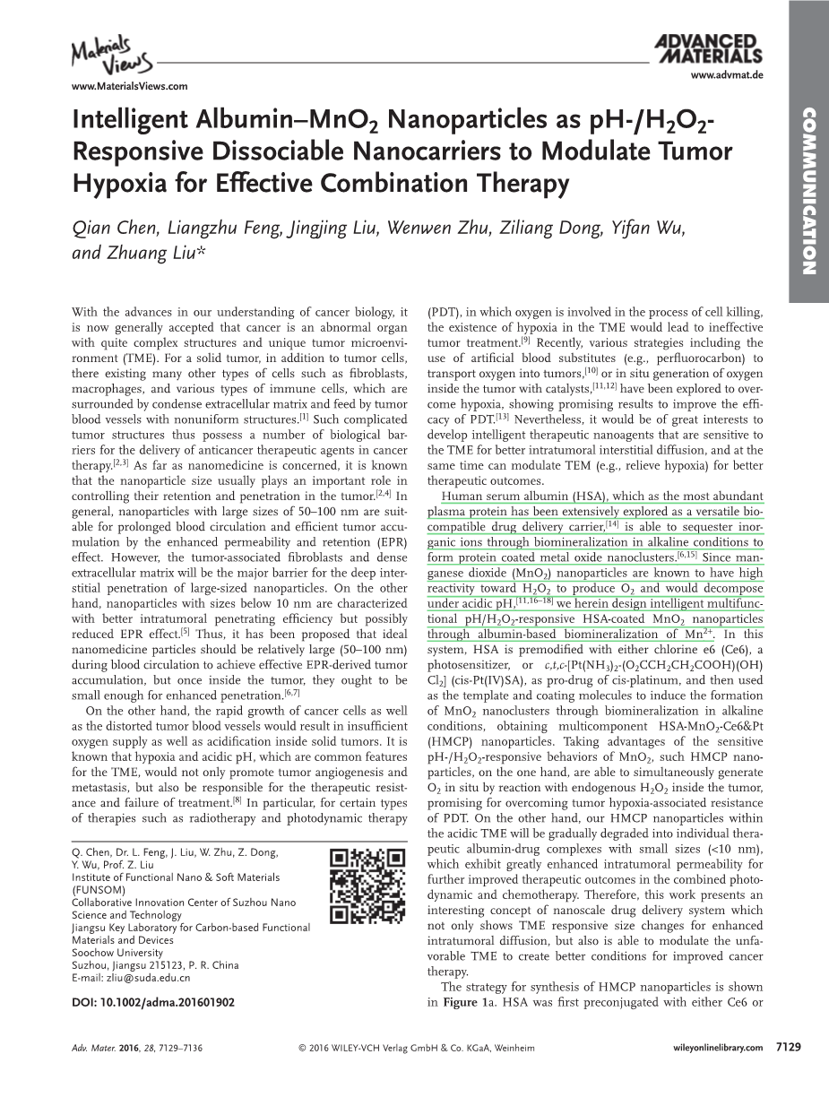 一个可以响应pH/H2O2然后分离纳米载体调节肿瘤缺氧进行有效联合治疗的智能型白蛋白-MnO2纳米颗粒