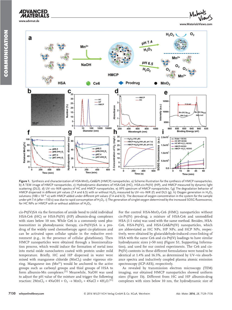 图一. HSA-MnO2-Ce6amp;Pt (HMCP) 纳米粒子的合成和表征。a)合成 HMCP 纳米颗粒的示意图。b)HMCP 纳米颗粒的 TEM 图像。c)HSA-Ce6 (HC)、HSA-cis-Pt (IV) (HP) 的流体力学直径,和动态光散射 (DLS) 法测定的 HMCP。d)HC 和 HMCP 纳米颗粒的紫外-可见-近红外光谱。e)HMCP 纳米颗粒的 XPS 光谱。f,g)用紫外-可见-近红外 (f) 和 DLS (g) 测定了分散在不同 pH 值(7.4 和 6.5)、有或无 H2O2 条件下 HMCP 的降解行为。h)在不同 pH 值(7.4 和 6.5)下加入 HMCP 的 H2O2 溶液(100times;10-6 M)中生成氧气。pH 7.4(约150 s 后)下样品系统中氧浓度的降低是由于 H2O2的快速消耗。i)对于添加或不添加 H2O2 的 HC NPs 或 HMCP,通过增加的 SOSG 荧光测定单线态氧的生成。