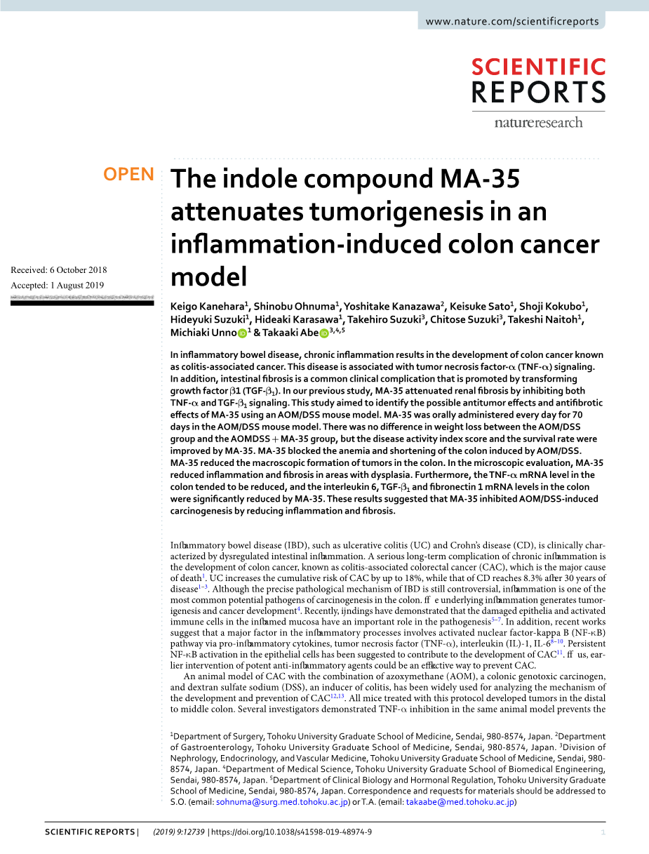 在炎症性肠病中,慢性炎症会导致结肠癌的发展,即结肠炎相关癌症。本病与肿瘤坏死因子-alpha; (tnf-alpha;)信号相关。此外,肠道纤维化是一种常见的临床并发症,由转化生长因子beta;1 (TGF-beta;1)促进。在我们之前的研究中,MA-35通过抑制tnf-alpha;和TGF-beta;1信号通路减轻了肾纤维化。本研究旨在通过AOM/DSS小鼠模型研究MA-35可能的抗肿瘤和抗纤维化作用。在AOM/DSS小鼠模型中,每天口服MA-35,持续70天。AOM/DSS组与AOMDSS MA-35组体重减轻无明显差异,但MA-35改善了疾病活动指数评分和生存率。MA-35阻断AOM/DSS诱导的贫血和结肠缩短。MA-35减少结肠肿瘤的宏观形成。在显微镜下观察,MA-35减少了异型增生区域的炎症和纤维化。此外,MA-35可显著降低结肠TNF-alpha; mRNA水平,降低结肠白细胞介素6、TGF-beta;1和纤维连接蛋白1 mRNA水平。这些结果表明,MA-35通过减少炎症和纤维化来抑制AOM/DSS诱导的癌变。