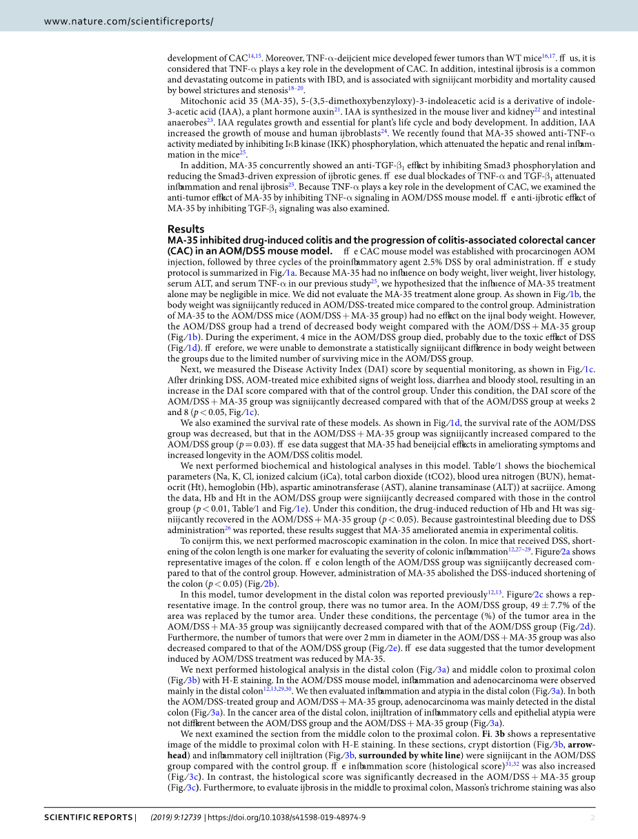 此外,MA-35通过抑制Smad3磷酸化和降低Smad3驱动的纤维化基因表达,同时具有抗TGF -beta;1作用。TNF-alpha;和TGF-beta;1的双重阻断可减轻炎症和肾纤维化25。由于TNF-alpha;在CAC的发生发展中起关键作用,我们通过抑制TNF-alpha;信号通路检测了MA-35在AOM/DSS小鼠模型中的抗肿瘤作用。同时观察了MA-35通过抑制TGF-beta;1信号通路的抗纤维化作用。