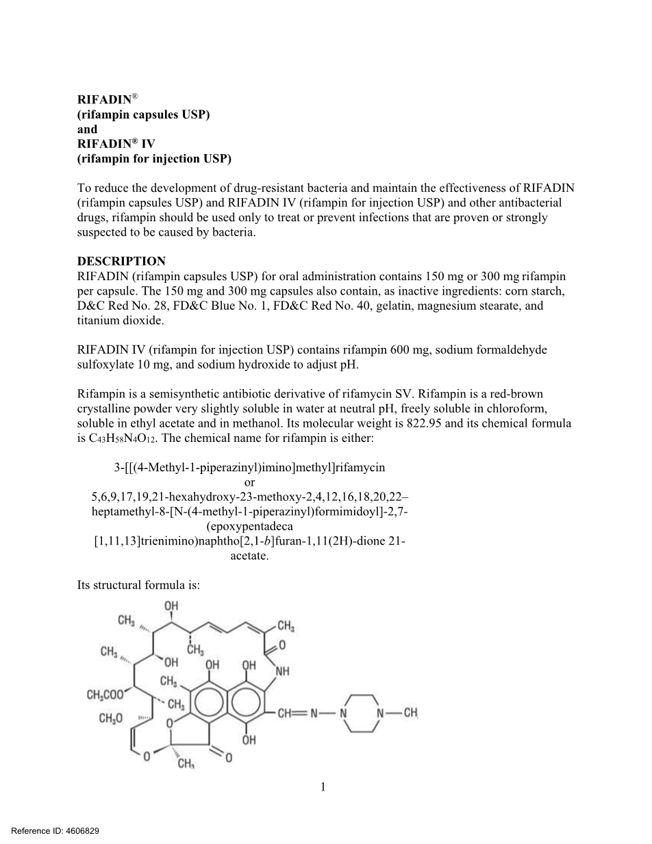 RIFADIN(利福平胶囊USP)口服给药每粒胶囊含150 mg或300 mg利福平。150 mg和300 mg胶囊还含有非活性成分:玉米淀粉、Damp;C红色28号、FDamp;C蓝色1号、FDamp;C红色40号、明胶、硬脂酸镁和二氧化钛。