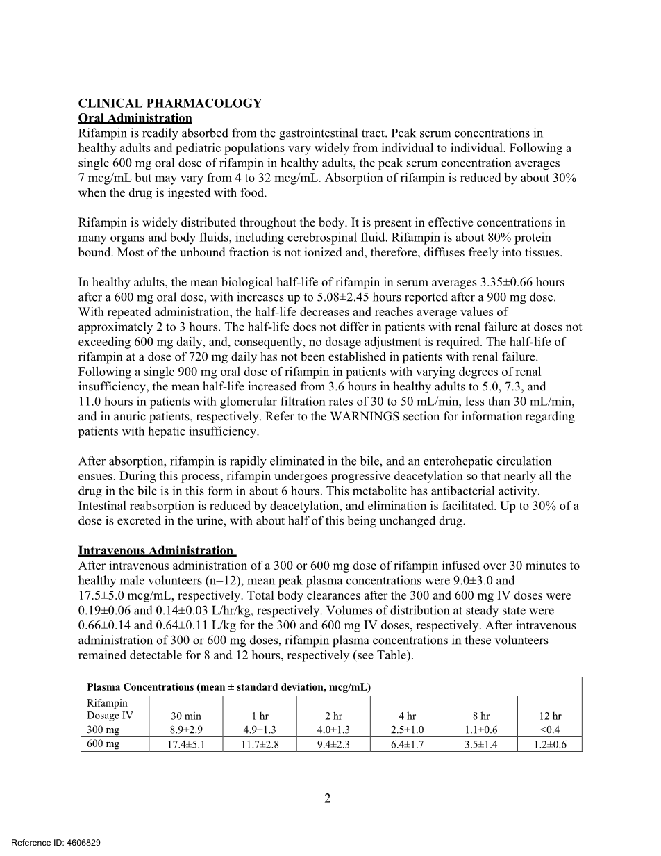 健康男性志愿者(n = 12)静脉输注利福平300或600 mg 30 min后,平均血浆峰浓度分别为9.0plusmn;3.0和17.5plusmn;5.0mu;g/mL。300和600 mg IV给药后的全身清除率分别为0.19plusmn;0.06和0.14plusmn;0.03 L/h/kg。300和600 mg IV给药后的稳态分布容积分别为0.66plusmn;0.14和0.64plusmn;0.11 L/kg。300或600 mg剂量静脉给药后,这些志愿者的利福平血浆浓度分别在8小时和12小时内可检测到(见表)。