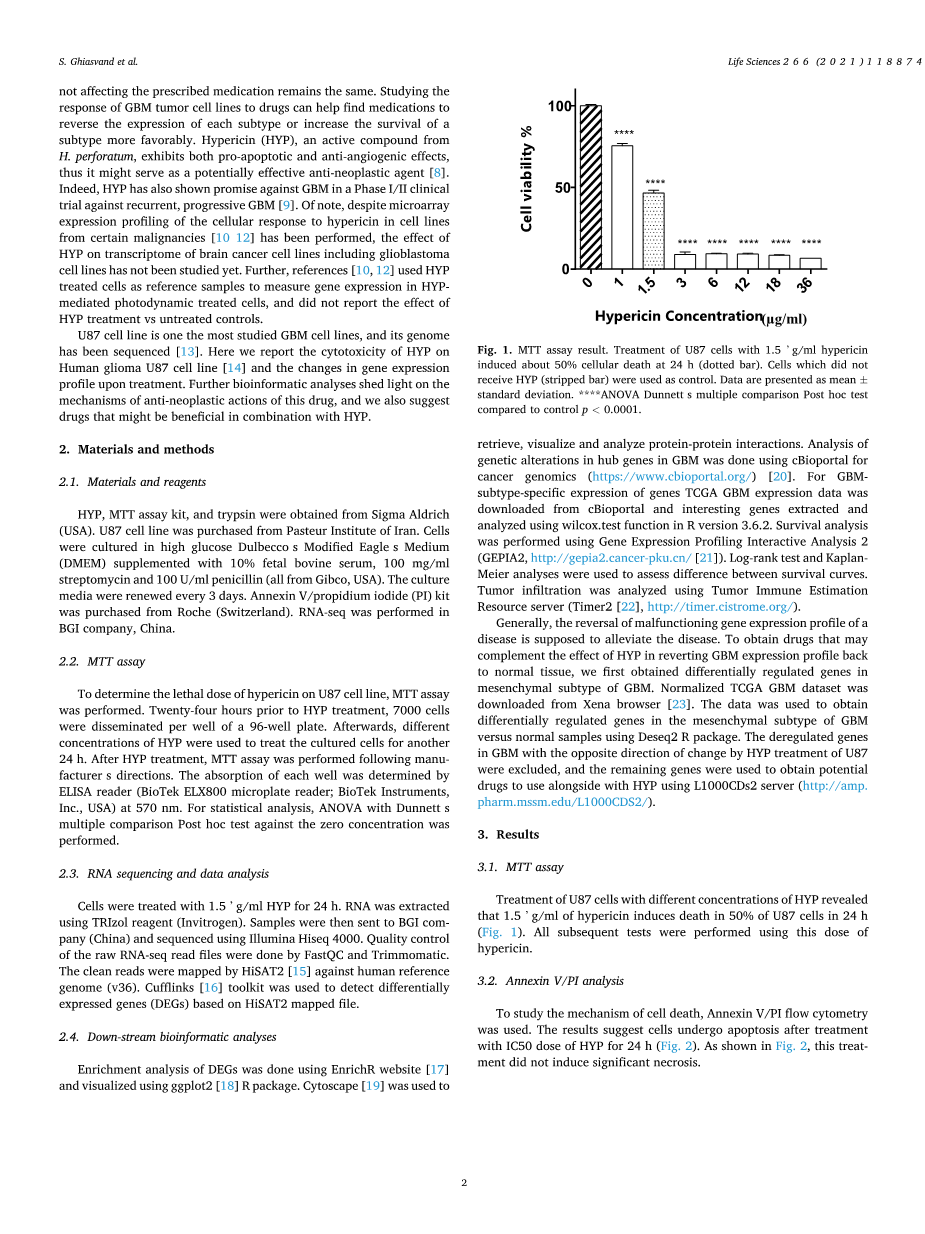 成人最常诊断的原发性脑癌是胶质母细胞瘤(GBM)。患者中位生存期为15个月左右,5年生存率低于5%. 尽管采取积极的治疗方案,即手术切除肿瘤,随后采用替莫唑胺(TMZ)进行放化疗双重治疗,但效果较差。.此外,GBM患者的复发率很高,部分原因是肿瘤的弥漫性和脑内肿瘤切除的限制。GBM的高复发率也可能部分归因于TMZ化疗对GBM stemness的影响。肿瘤的干性在一定程度上也是某些转录因子如SOX2、OCT4、NANOG、MYC和等作用的结果。不幸的是,前沿的GBM免疫治疗由于肿瘤的寒冷性而失败,增强肿瘤浸润的药物可能有助于对抗GBM;因此,对这种疾病似乎需要更有效的治疗。GBM治疗的另一个注意事项是缺乏基于疾病亚型的分层治疗。GBM肿瘤可分为间叶型、神经型、经典型和前神经型,但不影响处方用药的亚型相同。研究GBM肿瘤细胞系对药物的反应可以帮助寻找药物来逆转每个亚型的表达,或更有利地增加一个亚型的存活。金丝桃素(HYP),一种来自H的活性化合物。穿孔,表现出促凋亡和抗血管生成的作用,因此它可能作为一种潜在的有效的抗肿瘤药物.事实上,HYP在针对复发的、渐进的GBM的I/II阶段临床试验中也显示了对GBM的承诺.值得注意的是,尽管微阵列表达谱显示了某些恶性肿瘤细胞株对金丝桃素的细胞反应目前,HYP对包括胶质母细胞瘤细胞系在内的脑癌细胞系转录组的影响尚未研究。此外,参考文献以HYP处理细胞为参考样本,测定HYP介导的光动力处理细胞中基因的表达,未报告HYP处理对未处理对照的影响。HOS骨肉瘤系是研究最多的GBM细胞系之一,其基因组已被测序为。本文报道了HYP对人脑胶质瘤HOS骨肉瘤系的细胞毒性及治疗后基因表达谱的变化。进一步的生物信息学分析阐明了该药物的抗肿瘤作用机制,并提出了与HYP联合使用可能有益的药物。