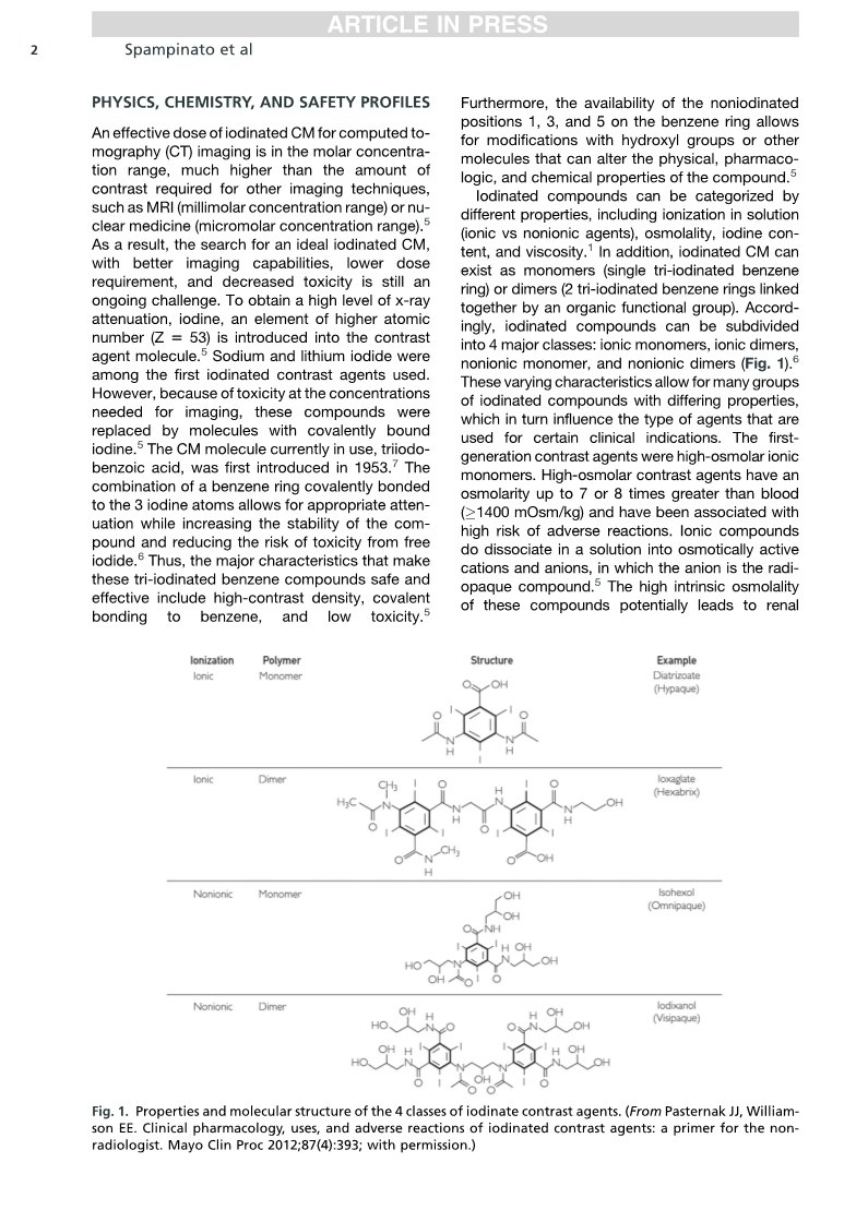 intra-arterially, although routes of administration include enteric, intrathecal, or direct injection,among others.1 The first applications of CM were reported as early as the 1920s, when the first iodine-based contrast agents were used in angiographic and pyelographic applications.2 Early iodinated CM were derived from a triiodobenzoic acid precursor and were ionic compounds of high osmolality. However, as research into the properties of CM continued, the toxicity and risk of reactions associated with ionic high osmolality CM led to the use of safer, nonionic, lower osmolality CM.3,4
