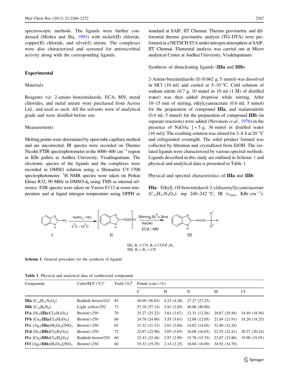 制备配合物IVa和IVd,CuCl2·2H2O(0.34g,2mmol)的NiCl2·6H2O(0.469g,2mmol)的乙醇溶液)用于制备配合物IVb和IVe,将用于制备配合物IVc和IVf的AgNO3(0.339g,2mmol)滴加到相应的配体[IIIa(0.257g,1mmol),IIIb(0.210g ,1mmol)在分开的反应中]茴香醚(10ml),同时搅拌,然后加入2-3滴三乙胺。 将反应混合物回流3-4小时并冷藏过夜(Mishra和Jha, 1993)。 过滤得到的固体,依次用乙醇和乙醚洗涤,真空干燥。 表中列出了分离的配合物的物理和分析数据。