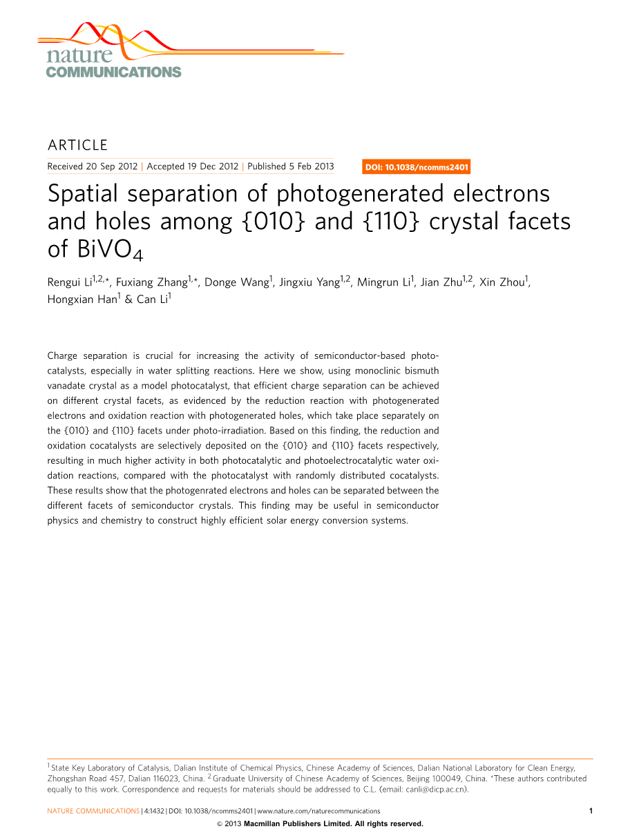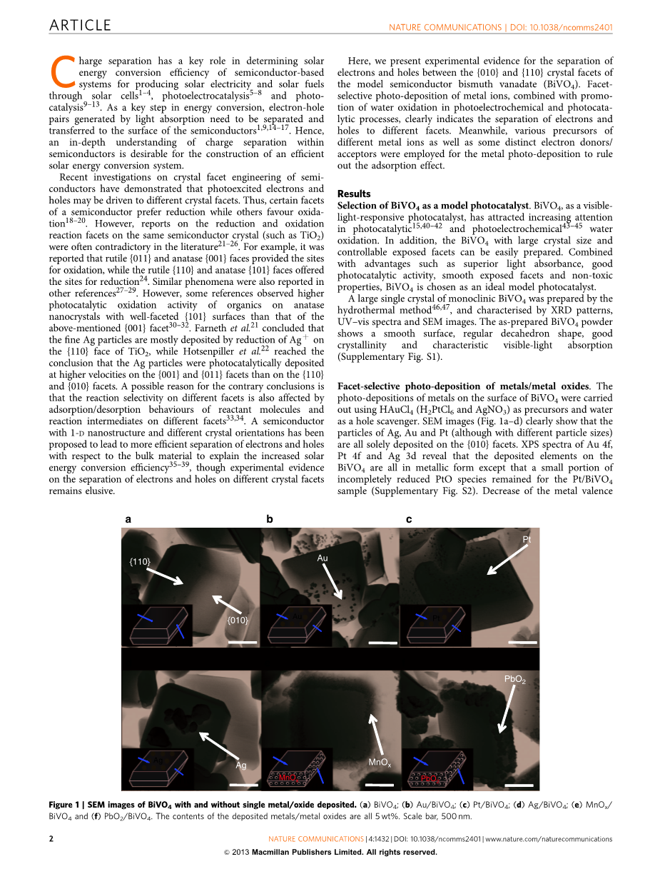 在这里,我们给出了模型半导体钒酸铋(BiVO4)的{010}和{110}晶面之间电子和空穴分离的实验证据。 在光电化学和光解析过程中,金属离子的选择性光沉积与促进水氧化反应结合在一起,清楚地表明电子和空穴分离到不同的晶面。同时,不同金属离子的前体以及一些不同的电子供体/受体被用于金属光沉积以排除吸附效应。