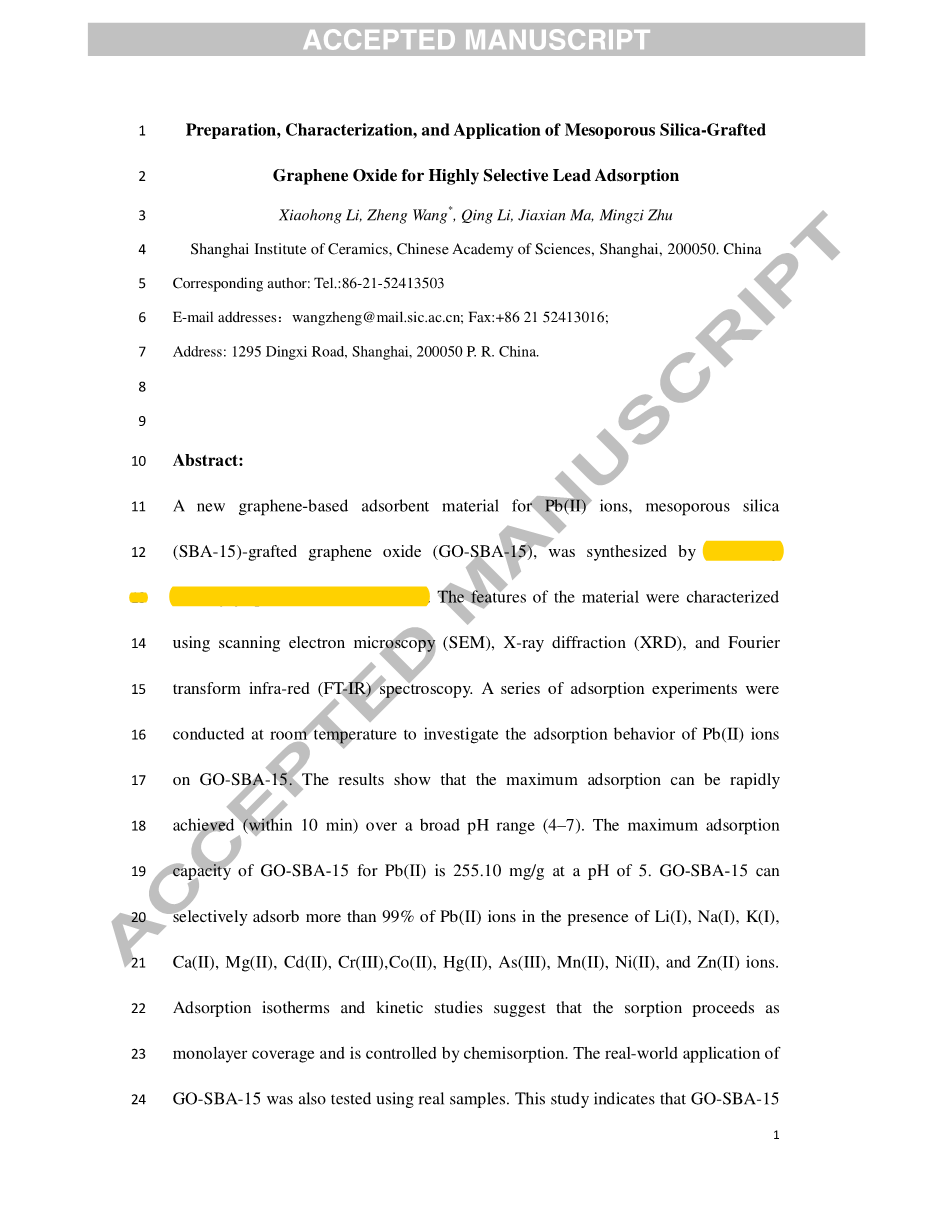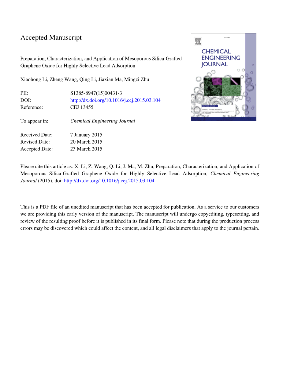 关键词:氧化石墨烯、选择性吸附、铅、介孔二氧化硅