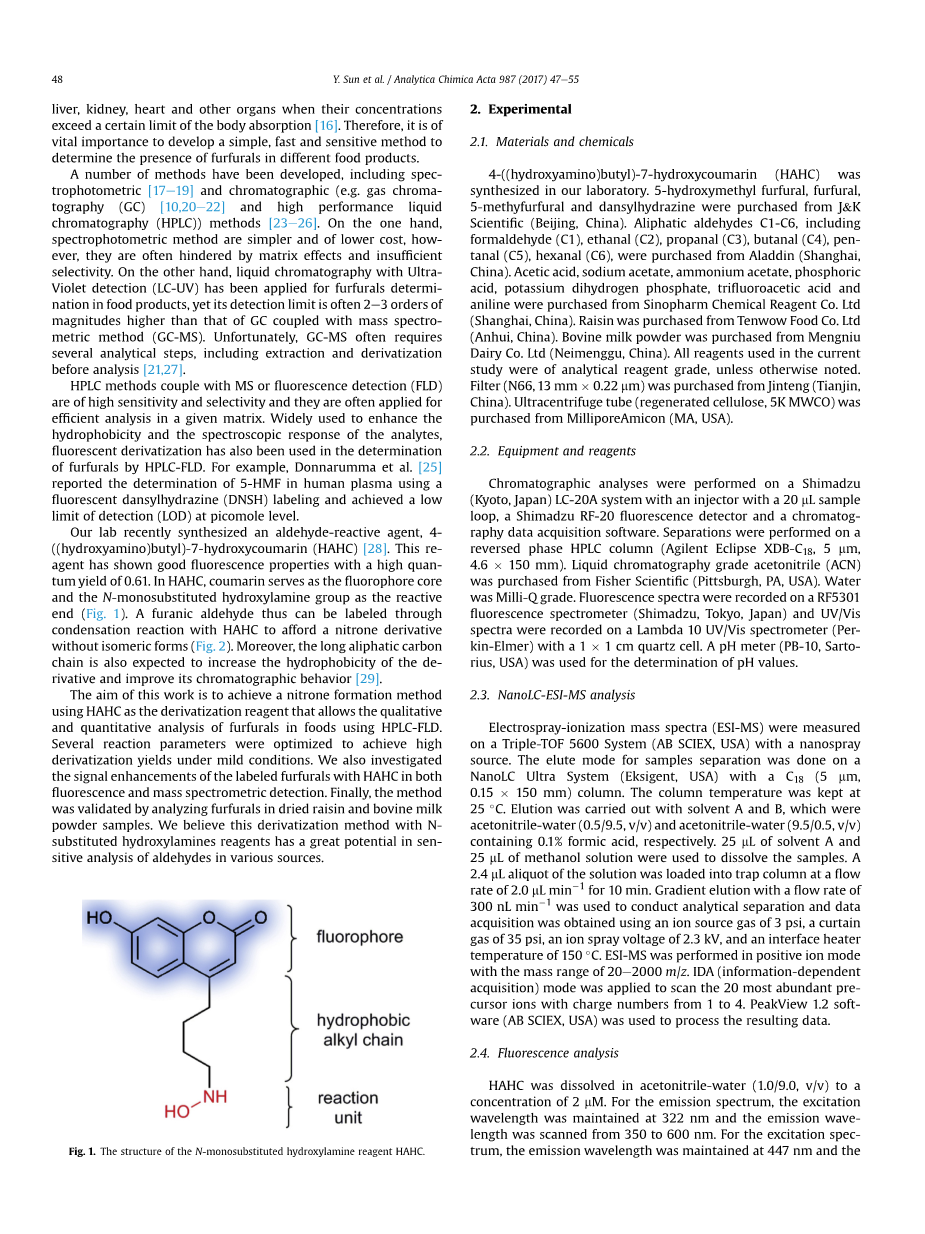 4 –((羟基氨基)丁基)-7-羟基香豆素(HAHC)在我们的实验室合成。 5-羟甲基糠醛,糠醛,5-甲基糠醛和丹酰肼购自J&K Scientific(北京,中国)。 脂肪醛C1-C6包括甲醛(C1),乙醛(C2),丙醛(C3),丁醛(C4),戊醛(C5),己醛(C6)。 醋酸,醋酸钠,醋酸铵,磷酸,磷酸二氢钾,三氟醋酸,苯胺购自国药集团化学试剂有限公司(上海,中国)。 葡萄干从Tenwow食品有限公司购买(中国安徽牛奶粉)。购自蒙牛乳业有限公司(中国内蒙古)。 目前使用的所有试剂除非另有说明,研究是分析试剂级。过滤器(N66,13mmle;0.22mm)购自敬腾(天津,中国)。 超速离心管(再生纤维素,5KMWCO)购自MilliporeAmicon(MA,USA)。
