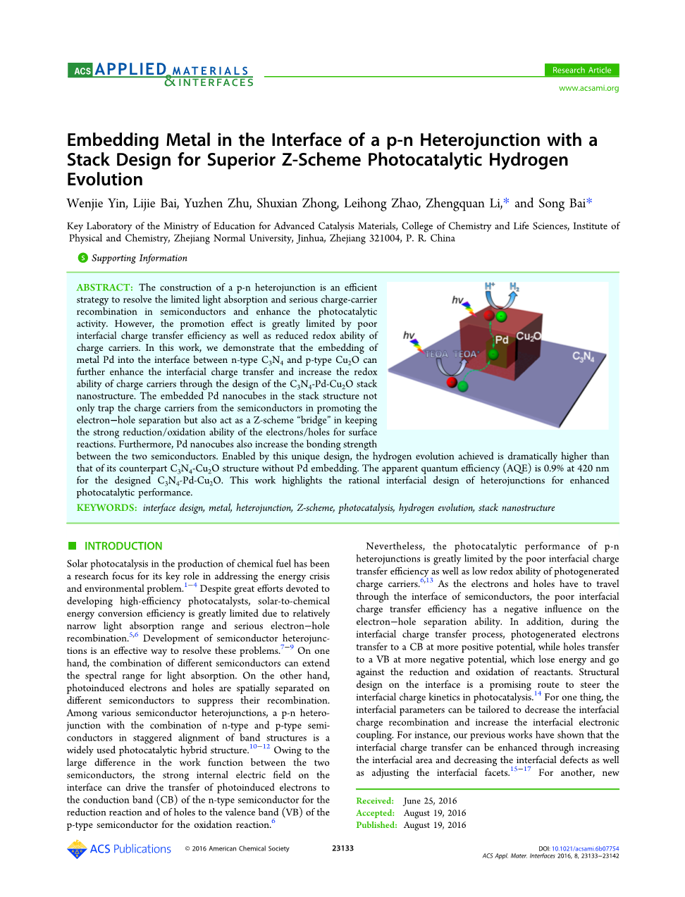 摘要:构建p-n异质结是解决半导体中有限的光收和严重的电荷 - 载流子复合并提高光催化活性的有效策略。 然而,促进效应受到界面电荷转移效率差以及载流子氧化还原能力下降的限制。 在这项工作中,我们证明金属钯嵌入n型C3N4和p型Cu2O之间的界面可以进一步增强界面电荷转移并增加电荷的氧化还原能力通过设计C3N4-Pd-Cu2O堆栈纳米结构。 堆叠结构中嵌入的Pd纳米立方体不仅捕获来自半导体的电荷载体以促进电子空穴分离,而且还充当Z型“桥”以保持电子/空穴对表面的强还原/氧化能力反应。 此外,钯纳米立方体也增加了结合强度两个半导体之间。 通过这种独特的设计,所获得的氢气释放显着高于没有Pd嵌入的对应C3N4-Cu2O结构。 设计的C3N4-Pd-Cu2O在420nm处的表观量子效率(AQE)为0.9%。 这项工作突出了异质结的合理界面设计以提高光催化性能。