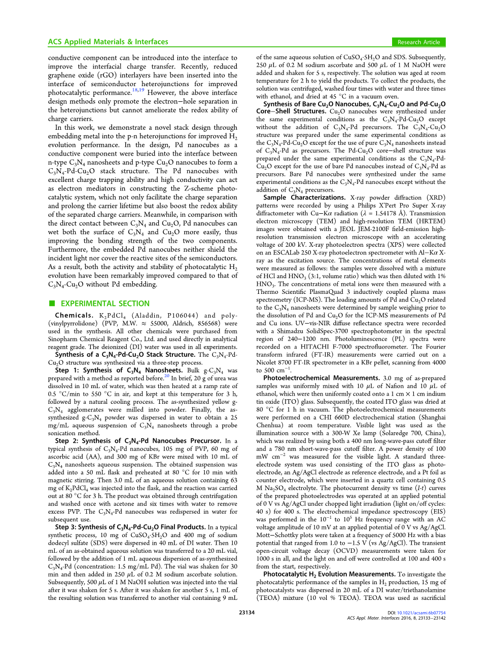 样品合成和表征。 C3N4-Pd-Cu2O堆叠结构的设计从可见光激发C3N4纳米片的选择开始,作为n型半导体模型图1一个)。 首先根据文献方法用尿素作为原料合成大块石墨相C3N4(gC3N4)(图S1),20 然后用超声波方法将其剥离成二维gC3N4纳米片。 在本体C3N4(数字 S2),强(002)峰对应于芳族链段的特征性层间堆叠,而(100)22对于C3N4纳米片,(100)峰消失,并且(002)峰的强度显着降低,表明层状C<s