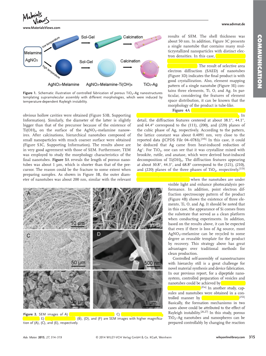 在新型材料和器件制造中,控制纳米结构自组装级仍然是一个很大的挑战。在我们之前的报告中,对于二肽纳米系统,可以通过调节肽的浓度来实现控制制备囊泡和纳米管。在另一项研究中,通过改变温度的方式获得可控的囊泡和纳米管。以上两种情况的形成机制可能是由于瑞利不稳定的影响。在该项研究中,当进行配位驱动的超分子组装时,可以通过改变反应温度来制备可控的多孔TiO2-Ag纳米管和纳米球。具体细节如图5所示: