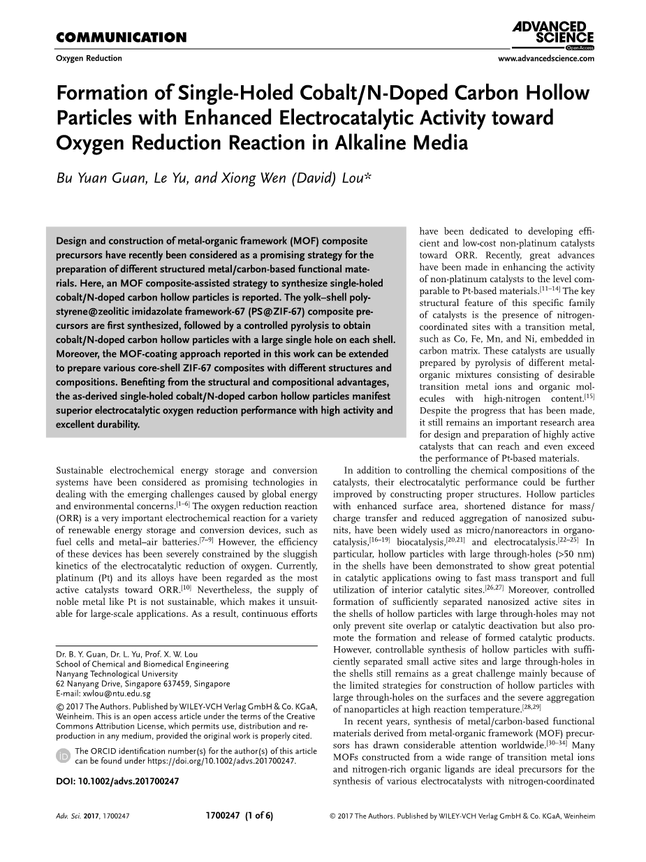 近年来,我们社会日益增长的能源需求激发了全球对化石燃料替代能源的寻求。电化学装置如燃料电池和金属空气电池预计将用于未来的汽车应用[1-2]。然而,由于阴极氧还原反应(ORR)的动力学缓慢,更高效的电催化剂已被广泛应用在这些领域仍然是非常需要的[3-5]。迄今为止,Pt和Pt基电催化剂作为ORR的最佳催化材料占据主导地位[6],尽管成本高,长期稳定性差以及Pt稀缺性不足阻碍其商业化[7-10]。因此,对具有可比电化学性能的四电子(4e)ORR高活性非铂催化剂的研究对于优化燃料电池的性能具有重要意义[11-14]
