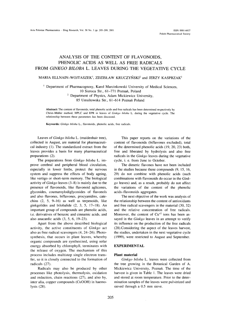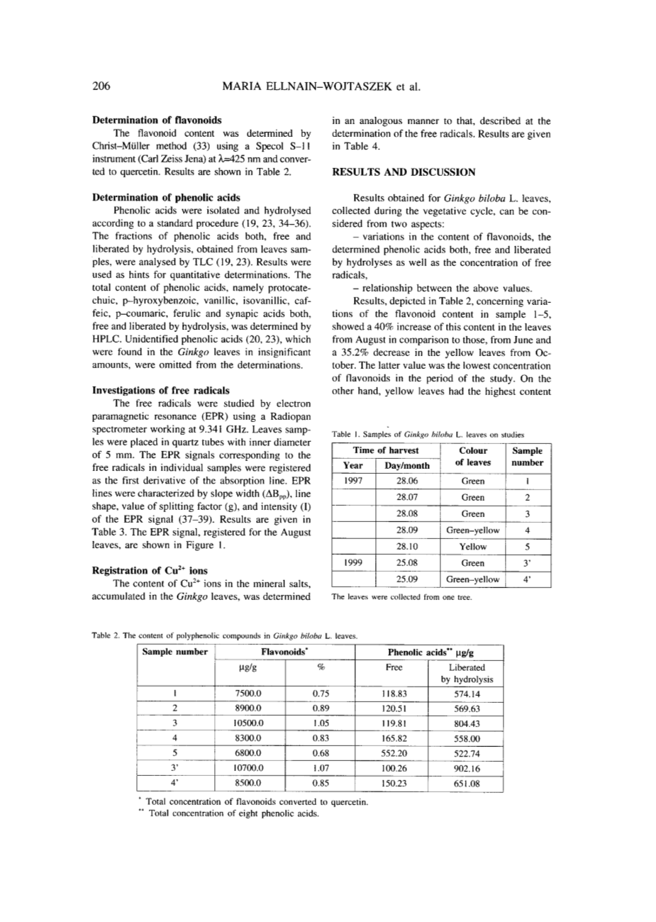 通过Christ-Muller方法、HPLC和EPR精确测量处于生长期的银杏叶中的黄酮、酚酸和自由基的含量,并讨论了这些参数之间的联系。