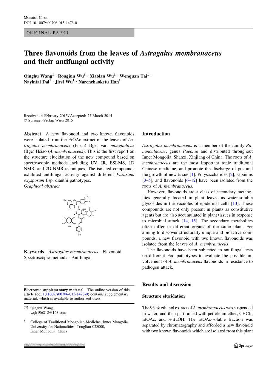 摘 要:从黄芪叶提取物中分离到一个新的黄酮类化合物和两个已知的黄酮类化合物。这是首次报道了基于UV、IR、ESI-MS、1D NMR等光谱技术的新化合物的结构阐明。 分离出的化合物对不同的尖孢镰刀菌具有一定的抗真菌活性。Dianthi病型。