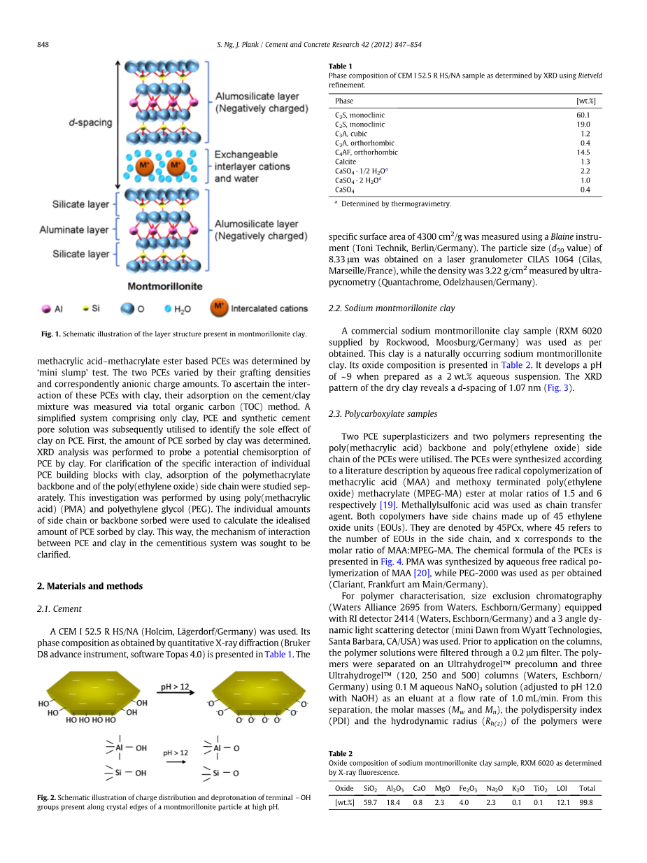在本研究中,我们研究了在水泥中加入粘土(水泥用量:1%)对两种聚羧酸盐基的减水剂性能的影响。采用天然钠蒙脱土。首先,粘土对两种不同掺量的水泥浆体和易性的影响采用“微坍落度”试验测定了甲基丙烯酸-甲基丙烯酸酯基pce。两种pce的接枝密度不同,阴离子电荷量也不同。为了确定这些pce与粘土的相互作用,用总有机碳(TOC)法测定了它们对水泥/粘土混合物的吸附。随后,我们使用了一个由粘土、PCE和合成水泥孔隙溶液组成的简化系统来识别粘土对PCE的唯一影响。首先,测定了粘土对PCE的吸附量。用XRD分析了粘土对PCE的潜在化学吸附。为了澄清单个PCE砌块与粘土的特异性相互作用,分别研究了聚甲基丙烯酸酯主链和聚(环氧乙烷)侧链的吸附。本研究采用聚甲基丙烯酸(PMA)和聚乙二醇(PEG)进行。用侧链吸附量和主链吸附量来计算理想的粘土吸附量。通过这种方法,我们试图阐明PCE与粘土在胶凝体系中的相互作用机理。