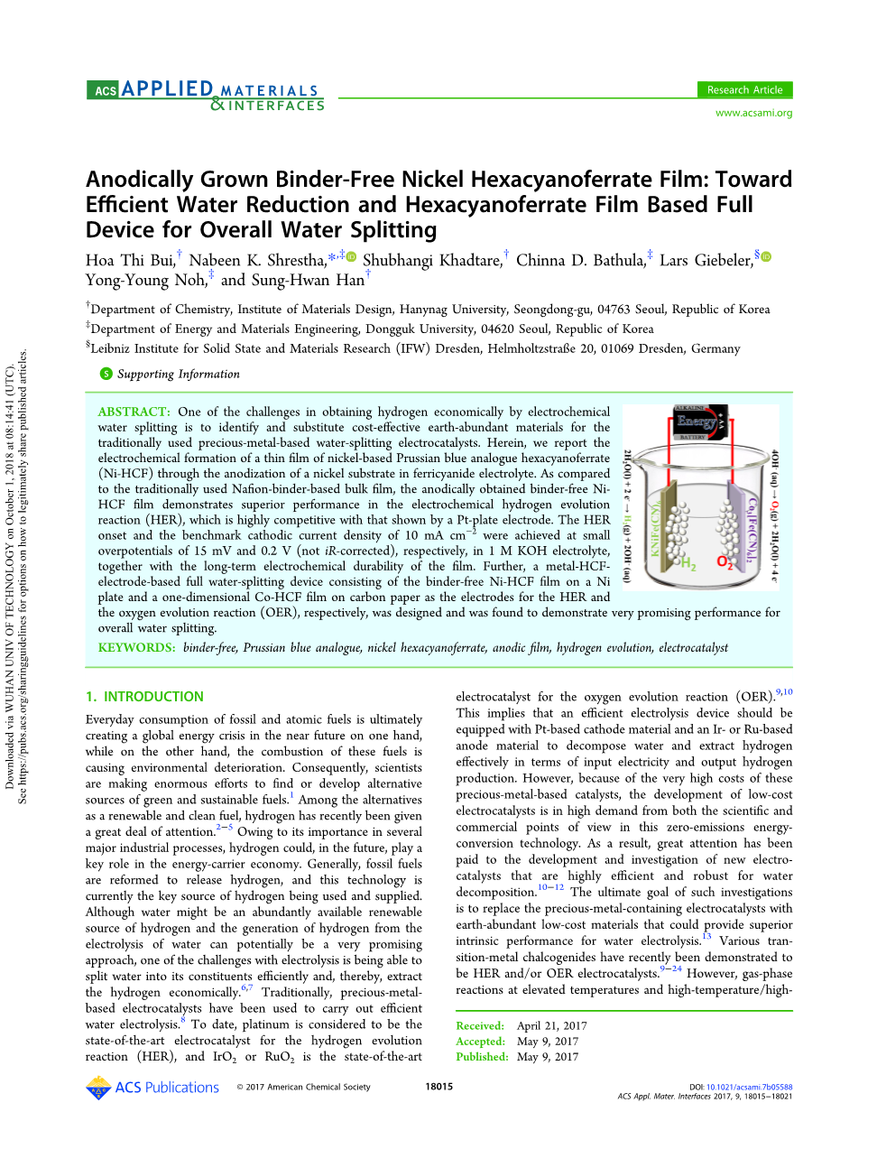 阳极生长无粘接剂的镍铁氰化物薄膜:面向高效水还原以及基于铁氰化物薄膜的全水分解器件
