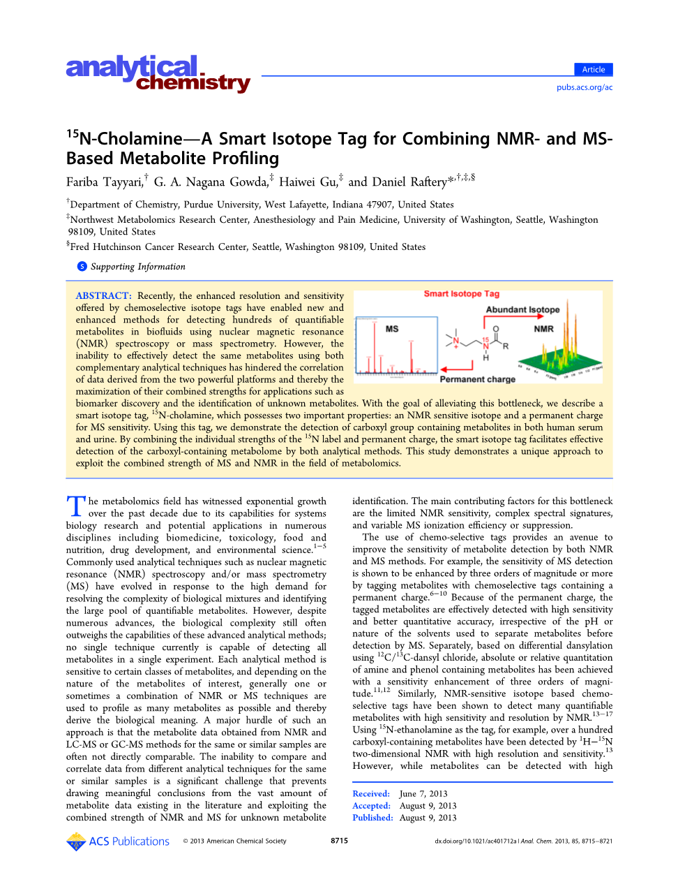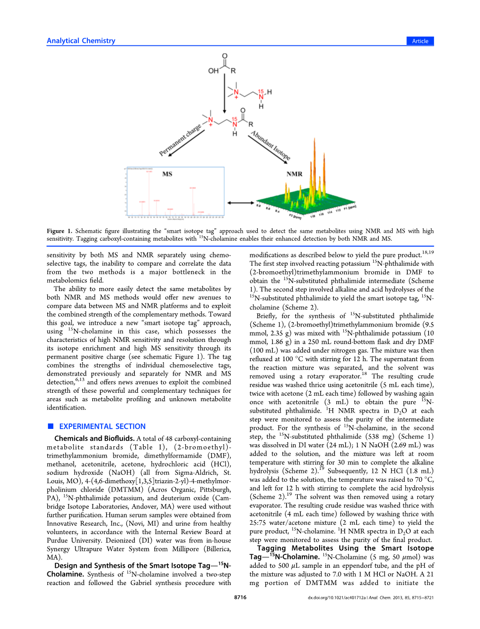 通过共同使用NMR和MS方法可以更容易地检测相同代谢物,这种能力将为比较MS和NMR平台之间的数据以及充分利用两种互补方法的综合优势提供了新途径。为了实现这一目标,我们引入了一种新的“智能同位素标记”方法,即使用15N-cholamine,其通过同位素富集而具有高的NMR灵敏度和分辨率,并通过其永久性正电荷而具有高的MS灵敏度(请参见图1)。该标记物结合了先前分别用于NMR和MS检测的单独化学选择性标记物的优势,并提供了新的方法来充分发挥这些强大、互补的技术之间的结合优势,应用于代谢物谱分析和未知代谢物鉴定等领域。