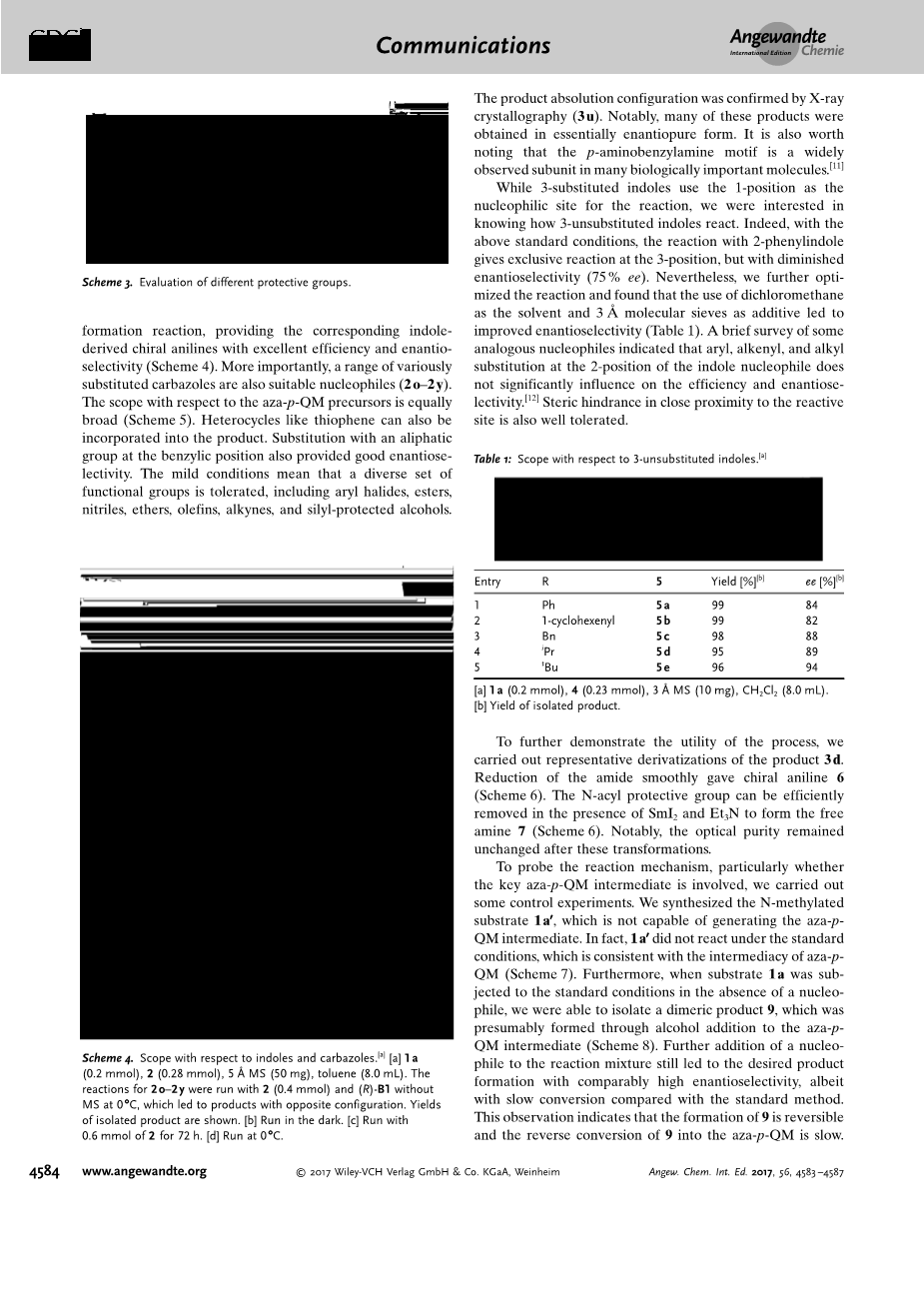 在掌握最佳条件的情况下,我们接下来检查了底物的适用范围。各种各样的取代吲哚顺利参与分子间CN键形成反应,提供了具有出色效率和对映选择性的相应的吲哚衍生物手性苯胺(图示4)。更重要的是,一系列不同取代的咔唑也是合适的亲核试剂(2 o–2 y)。关于氮杂-对-醌甲基化物前体的范围同样广泛(图示5),像噻吩这样的杂环也可以引入产物中,在苄基位置被脂族基团取代也有良好的对映选择性。温和的条件意味着可以耐受各种官能团,包括芳基卤化物,酯,腈,醚,烯烃,炔烃和甲硅烷基保护的醇。