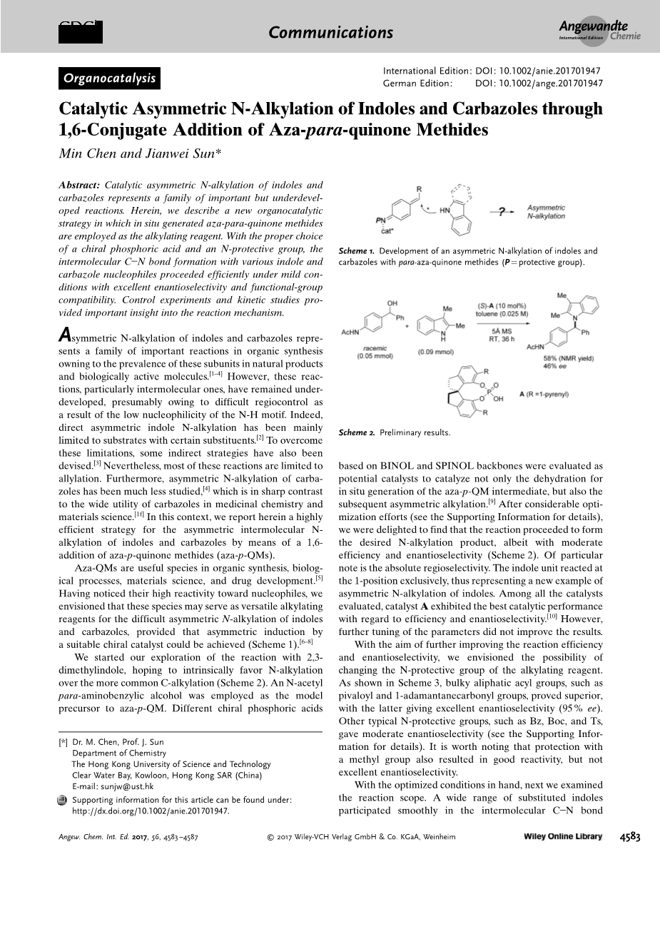 摘要:吲哚和咔唑的催化不对称N-烷基化反应代表了一类重要但尚未开发的反应。在这里,我们描述了一种新的有机催化策略,即原位生成的氮杂-对醌甲基化物被用作烷基化试剂。通过选择适当的手性磷酸和N-保护基, 亲核试剂吲哚及咔唑参与的分子间CN键的形成能在在温和条件下以优秀的对映选择性和官能团相容性高效地进行。对照实验和动力学研究为 机理的研究提供了重要的依据。