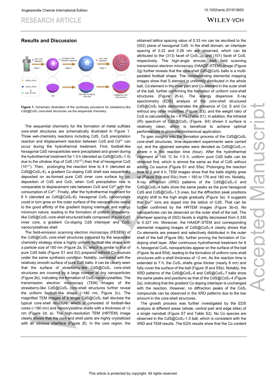 在本文中,我们证实了一种通用的顺序合成法,它可以在水溶液中通过调节化学组分和光洁的表面来合成高度均一的金属硫化物核-壳结构。我们发现,基于溶度积常数的顺序合成法能够指导金属硫化物依次沉淀,从而形成均匀的核-壳结构。举一个典型的例子,实验所得的CdS@CoSx核-壳结构是一个粒子尺寸为180 nm的高度均一足球型形状,其中包括一个纯CdS内核(约160 nm)、一个梯度Co掺杂过渡层(约20 nm)和一个CoSx纳米晶壳(约2 nm)。其中,梯度Co掺杂CdS过渡层对调节CdS和CoS的晶格不匹配以形成均匀涂层具有重要作用。我们还证明了很多金属硫化物核-壳结构(例如CdS@CoSx、CdS@MnSx、CdS@NiSx、CdS@ZnSx、CuS@CdS和更复杂的CdS@ZnSx@CoSx)都可以通过这种依序生长的方法来合成。更有意思的是,这种合成的草莓型CdS@CoSx核-壳结构具有很高且稳定的光催化产氢活性,为3.92 mmol h-1,并在420 nm处表现出67.3%的表观量子效率,这是在非贵金属助催化剂修饰的CdS基光催化剂中表现的最佳数据之一。