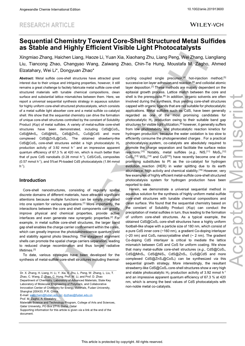 稳定高效的核-壳结构金属硫化物可见光光催化剂的顺序可控合成