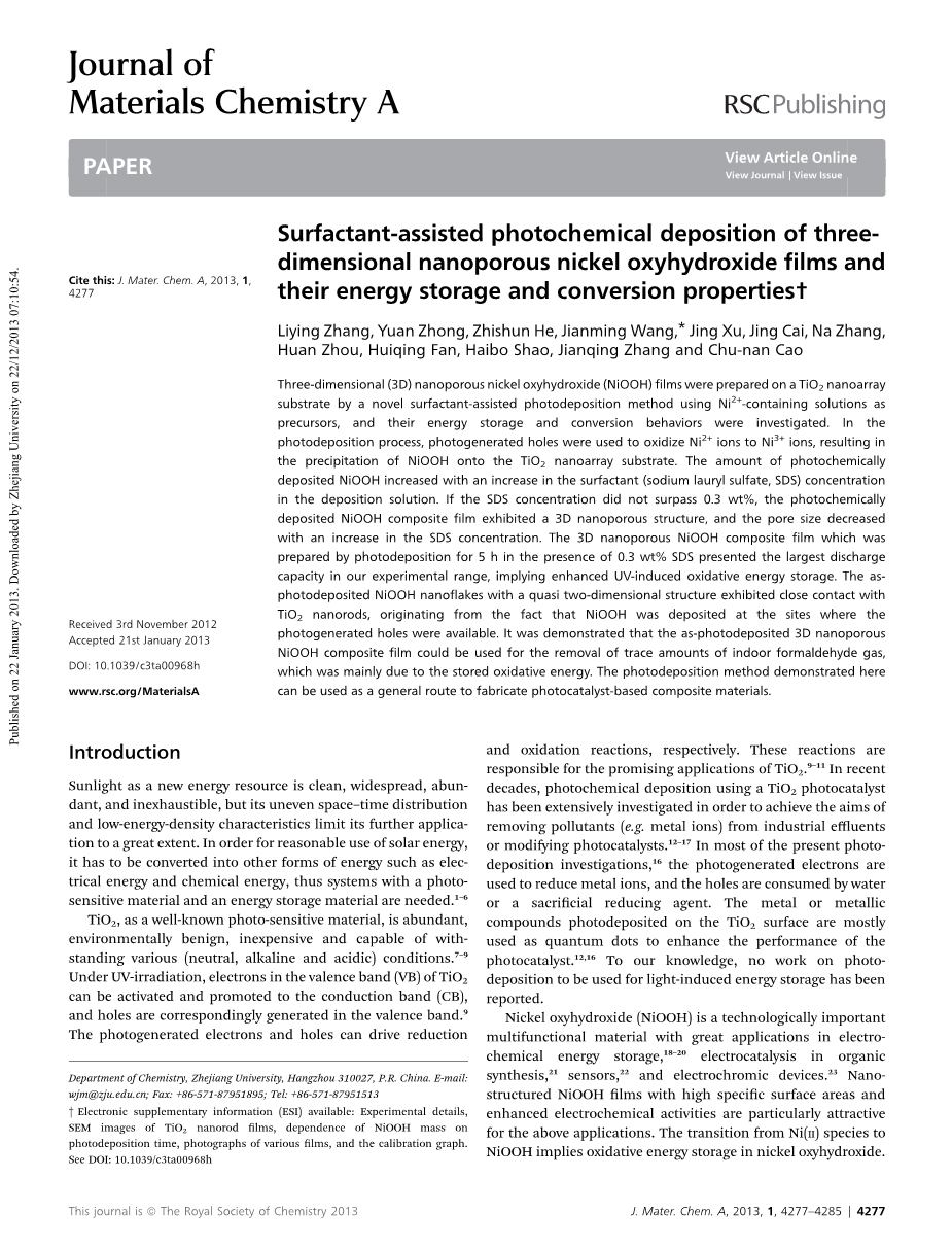 采用含Ni2 溶液作为前驱体的新型表面活性剂辅助光沉积法,在TiO2纳米阵列基底上制备了三维(3D)纳米多孔羟基氧化镍(NiOOH)薄膜,研究了它们的储能和转化行为。在光沉积过程中,光生空穴用于将Ni2 离子氧化成Ni 3 离子,导致NiOOH沉淀到TiO2纳米阵列基板上。随着沉积溶液中表面活性剂(十二烷基硫酸钠,SDS)浓度的增加,光化学沉积的NiOOH的量增加。如果SDS浓度不超过0.3wt%,则光化学沉积的NiOOH复合膜显示出3D纳米多孔结构,并且孔径随着SDS浓度的增加而降低。通过在0.3wt%SDS存在下光沉积5小时制备的3D纳米多孔NiOOH复合膜在我们的实验范围内呈现最大的放电容量,这意味着增强的UV诱导的氧化能量储存。具有准二维结构的光沉积的NiOOH纳米薄片表现出与TiO2纳米棒的紧密接触,这源于NiOOH沉积在可获得光生孔的位置的事实。结果表明,光沉积三维纳米多孔NiOOH复合薄膜可用于去除微量室内甲醛气体,这主要是由于储存的氧化能量。这里说明的光沉积方法可以用作制造光催化剂基复合材料的一般途径。