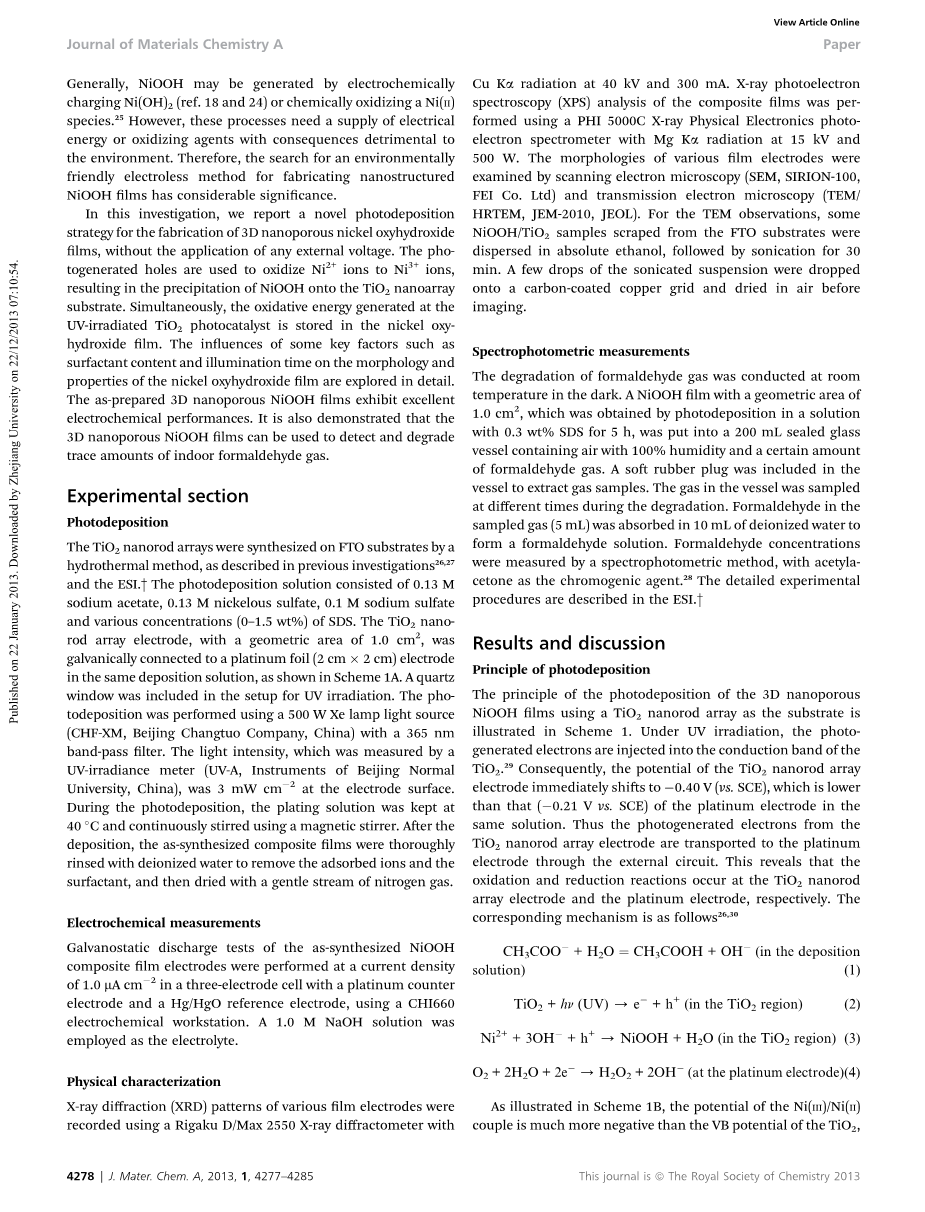 方案1说明了使用TiO2纳米棒阵列作为基板的3D纳米多孔NiOOH薄膜的光沉积原理。在紫外线照射下,光生电子被注入到TiO2的导带中。29因此,TiO2纳米棒阵列电极的电位立即转移到0.40 V (相对于SCE),这低于同一溶液中铂电极的电位(0.21 V vs. SCE)。因此,TiO2纳米棒阵列电极的光生电子通过外部电路传输到铂电极。这表明氧化和还原反应分别发生在TiO2纳米棒阵列电极和铂电极上。 相应的机制如下26,30: